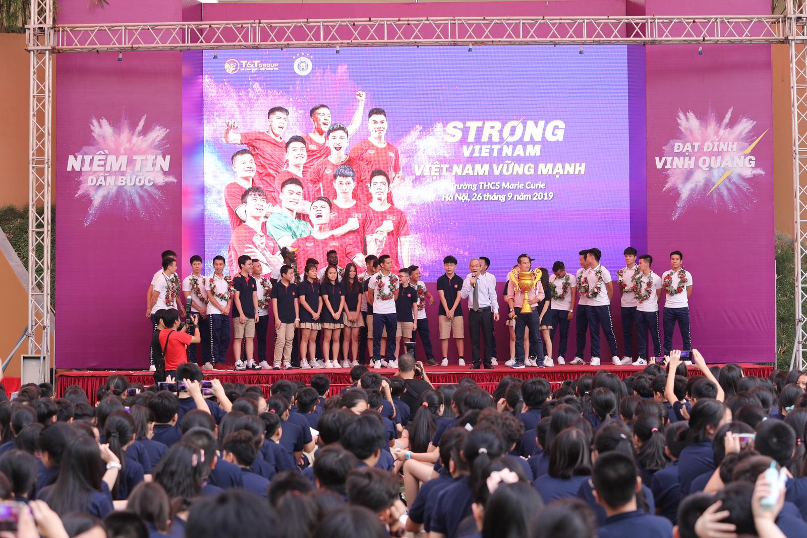 Chương trình “Strong Vietnam” do Tập đoàn T&T Group khởi xướng và thực hiện đã đến được với 3 trường là trường THCS Phù Đổng (Gia Lâm, Hà Nội), trường THCS Việt Nam - Angieri (Thanh Xuân, Hà Nội), trường THCS Nguyễn Trường Tộ (Đống Đa, Hà Nội). Trường phổ thông dân lập Marie Curie là điểm đến số 4 của chuỗi hành trình chia sẻ ước mơ hoài bão, niềm đam mê của các cầu thủ CLB bóng đá Hà Nội.Khoảng 4000 học sinh của trường Marie Curie và các thầy cô trong trường đã được hòa chung trong không khí vui tươi, náo nhiệt khi 19 cầu thủ của CLB bóng đá Hà Nội bước ra sân khấu giao lưu với các em học sinh. Đây là số cầu thủ đông nhất tham gia chương trình Strong Vietnam kề tử khi chương trình bắt đầu, gồm các cầu thủ trụ cột của Hanoi FC như Quang Hải, Duy Mạnh, Đình Trọng, Hùng Dũng, Đức Huy, Văn Kiên, Bùi Tiến Dũng…và các cầu thủ ngoại như Pape Omar, Oseni, Kebe. Dàn cầu thủ CLB bóng đá Hà Nội giao lưu với học sinh trường Marie CurieĐối mặt với fan nữ để mật mã điện thoại là ngày sinh của mình và ảnh đại diện cũng là hình ảnh của Trần Đình Trọng, sau vài phút lúng túng trước câu hỏi khó, Đình Trọng cũng kịp trấn tĩnh: “Hiện tại mẹ anh đang tuyển vợ cho em trai anh. Còn anh, khi nào có nhu cầu, anh sẽ tự tuyển”. Câu trả lời của Trần Đình Trọng đã nhận được tràng pháo tay tán thưởng của các em học sinh.Tại buổi giao lưu này, các em học sinh cũng đặt hàng loạt câu hỏi về quá trình tập luyện, thi đấu của các cầu thủ thuộc đội bóng đang sở hữu hàng loạt “sao” sáng của bóng đá Việt Nam - CLB Hà Nội. Trước câu hỏi “Anh Dũng ơi, em nghĩ không có anh Việt Nam không thể vô địch được AFF Cup 2018 và mong anh chia sẻ bí quyết nào để anh có cơ thể khỏe mạnh, cường tráng vậy”, Đỗ Hùng Dũng cho biết: “Bóng đá là môn thể thao tập thể và anh chỉ góp sức cùng các đồng đội vào thành công chung đó. Muốn có sức khoẻ, các em hãy rèn luyện thể thao hàng ngày và có lối sống lành mạnh. Anh thấy nhiều bạn trong trường có chiều cao còn cao hơn anh, đây là một điều kiện tốt để các em có một cơ thể cường tráng, mạnh mẽ”.Đình Trọng ngượng ngùng trước câu hỏi khó của fan nữĐặc biệt, cũng tại buổi giao lưu, các fan còn tổ chức sinh nhật cho Duy Mạnh và trổ tài tìm hiểu kiến thức bóng đá với trung vệ nổi tiếng này. Duy Mạnh cho biết anh rất xúc động khi được nhận món quà sinh nhật đầy bất ngờ.“Anh xin hứa sẽ cùng các đồng đội ở CLB bóng đá Hà Nội và đội tuyển quốc gia thi đấu, cống hiến hết mình mang về nhiều thành công hơn nữa cho bóng đá Việt Nam”. Vừa dứt câu trả lời, Duy Mạnh đã bị các em học sinh úp chiếc bánh vào mặt, như truyền thống của đội tuyển U23 Việt Nam. Anh chỉ kịp nói: Đến để truyền cảm hứng chiến thắng nhưng các cầu thủ CLB bóng đá Hà Nội lại được truyền cảm hứng khi gặp và nghe câu chuyện xúc động về một em học sinh của trường đã vượt qua căn bệnh hiểm nghèo để tiếp tục sống và học tập.Trưởng Ban tổ chức chương trình Strong Vietnam - Đỗ Vinh Quang chia sẻ về ý chí chiến đấu vượt qua bệnh hiểm nghèo của em học sinh trong trường“Hôm nay chúng tôi đến ngôi trường thân yêu này để truyền cảm hứng chiến thắng và ý chí phấn đấu, vượt qua gian khó. Nhưng khi đến đây bản thân chúng tôi cũng đã được em học sinh này truyền cảm hứng để có bản lĩnh, niềm tin vượt qua những tình huống khó khăn, thậm chí là nguy nan trong cuộc sống”, Trưởng BTC chương trình Strong Việt Nam Đỗ Vinh Quang chia sẻ.Các cầu thủ CLB bóng đá Hà Nội cũng đón nhận tình cảm đặc biệt của thầy và trò trường Marie Curie khi thầy hiệu trưởng Nguyễn Xuân Khang tặng vòng nguyệt quế cho các cầu thủ và chiếc Cup vô địch trong lòng người hâm mộ. Như thầy Khang chia sẻ, chiếc Cup này chứa đựng hàng vạn hàng triệu con tim của người hâm mộ dành tặng cho các cầu thủ tài năng của CB bóng đá Hà Nội cũng như các tuyển thủ quốc gia Việt Nam.Thầy hiệu trưởng trường Marie Curie thay mặt thầy và trò trong trường tặng chiếc Cup của người hâm mộ dành tặng các cầu thủ CLB bóng đá Hà NộiTại chương trình, Ban tổ chức “Strong Vietnam” cũng đã trao 20 suất học bổng cho các em học sinh trường Marie Curie và giáo cụ thể chất cho nhà trường để các em thêm điều kiện tập luyện thể dục thể thao.Chương trình “Strong Vietnam” do T&T Group khởi xướng và triển khai được kỳ vọng sẽ giúp các em học sinh giải quyết cả hai yếu tố: Truyền cảm hứng để các em sống có đam mê, hoài bão, nỗ lực theo đuổi ước mơ và xây dựng một thế hệ trẻ tràn đầy sức mạnh, cải thiện về thể chất, nhất là chiều cao.Chương trình dự kiến kéo dài đến hết tháng 10/2019.PV
