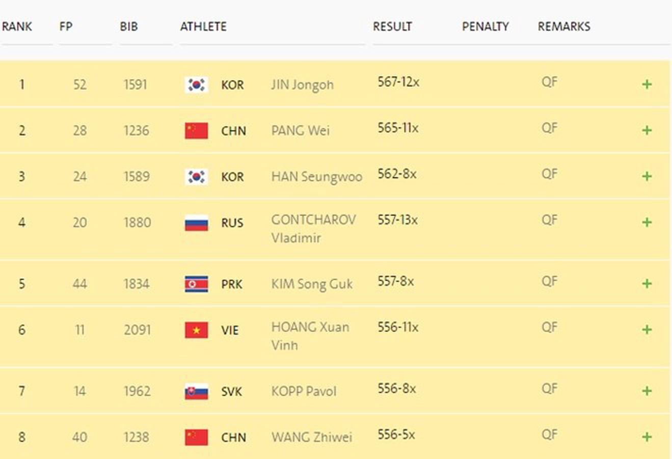 Ở vòng loại, Vinh xếp thứ 6 với 556 điểm, và sẽ cùng 7 xạ thủ khác bước vào nội dung chung kết diễn ra lúc 22 giờ đêm nay.