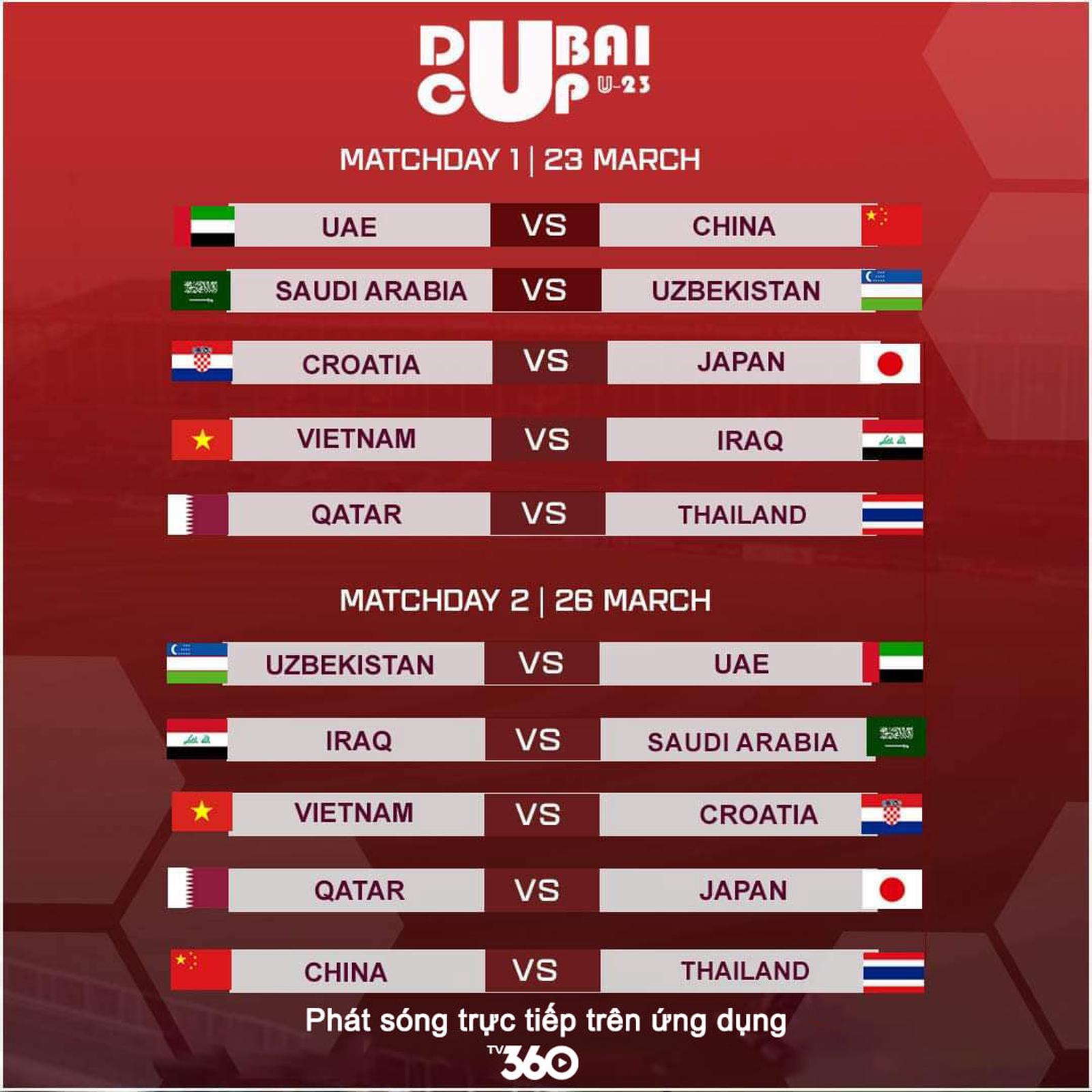 Tại đây, U23 Việt Nam góp mặt 2 trận gặp Iraq vào 23/3 và Croatia vào 26/3. Sau 2 trận này, U.23 Việt Nam còn đá 1 trận nữa ngày 29/3 với đối thủ liền kề trên bảng xếp hạng dựa trên kết quả thi đấu 2 trận vừa qua để tính thứ hạng tại giải đấu.