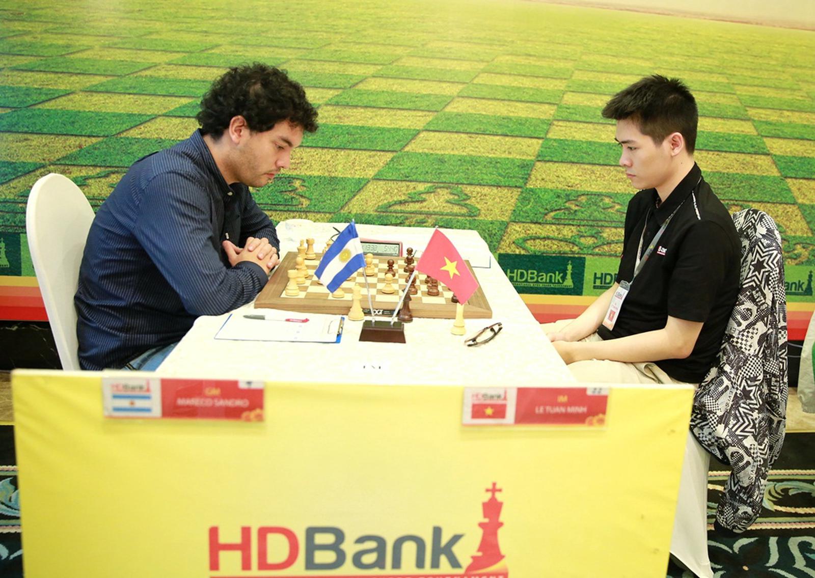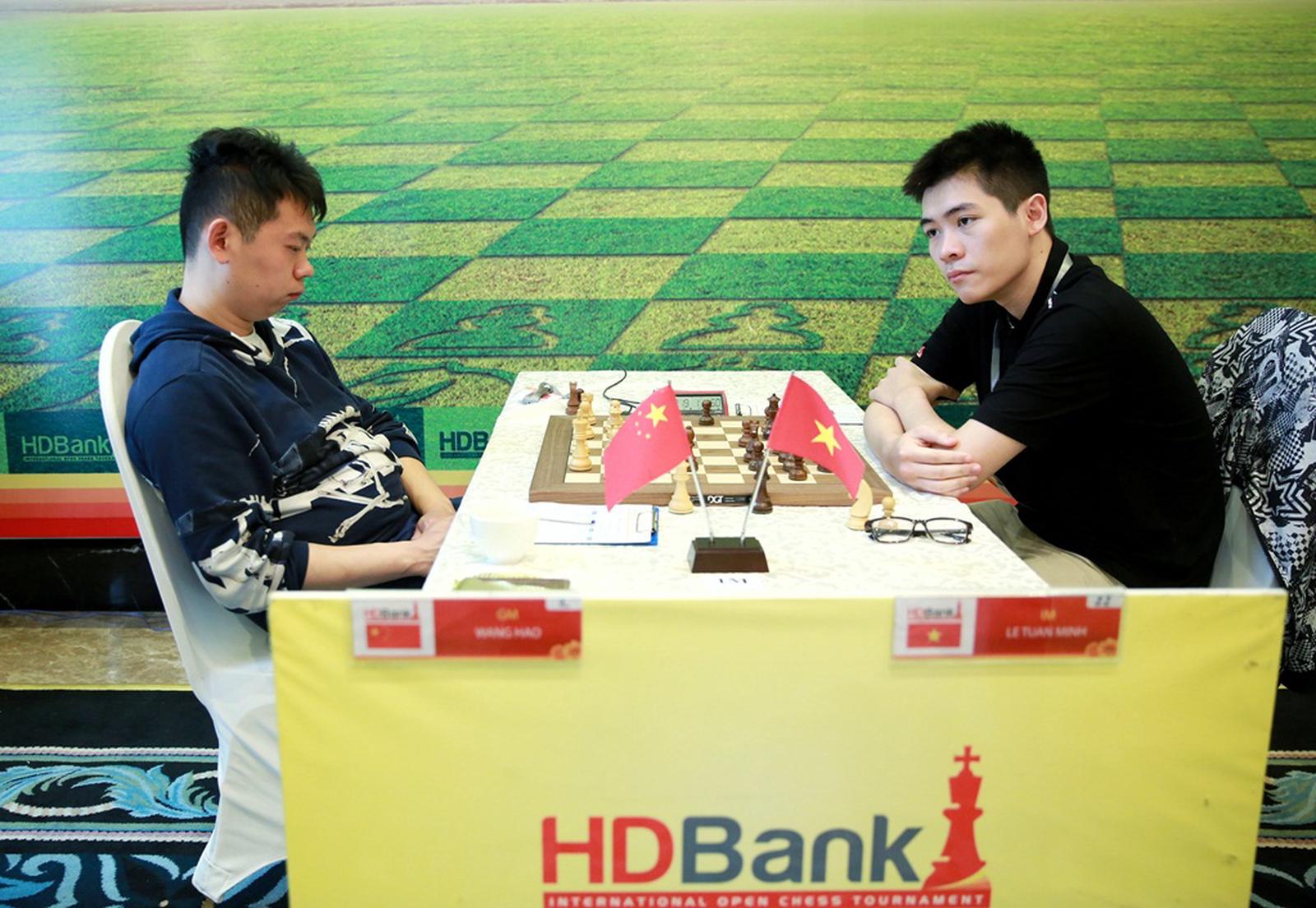 Lê Tuấn Minh đấu với Đại kiện tướng Wang Hao (Trung Quốc), đương kim vô địch Châu Á, Vô địch giải Cờ vua quốc tế HDBank 2016.