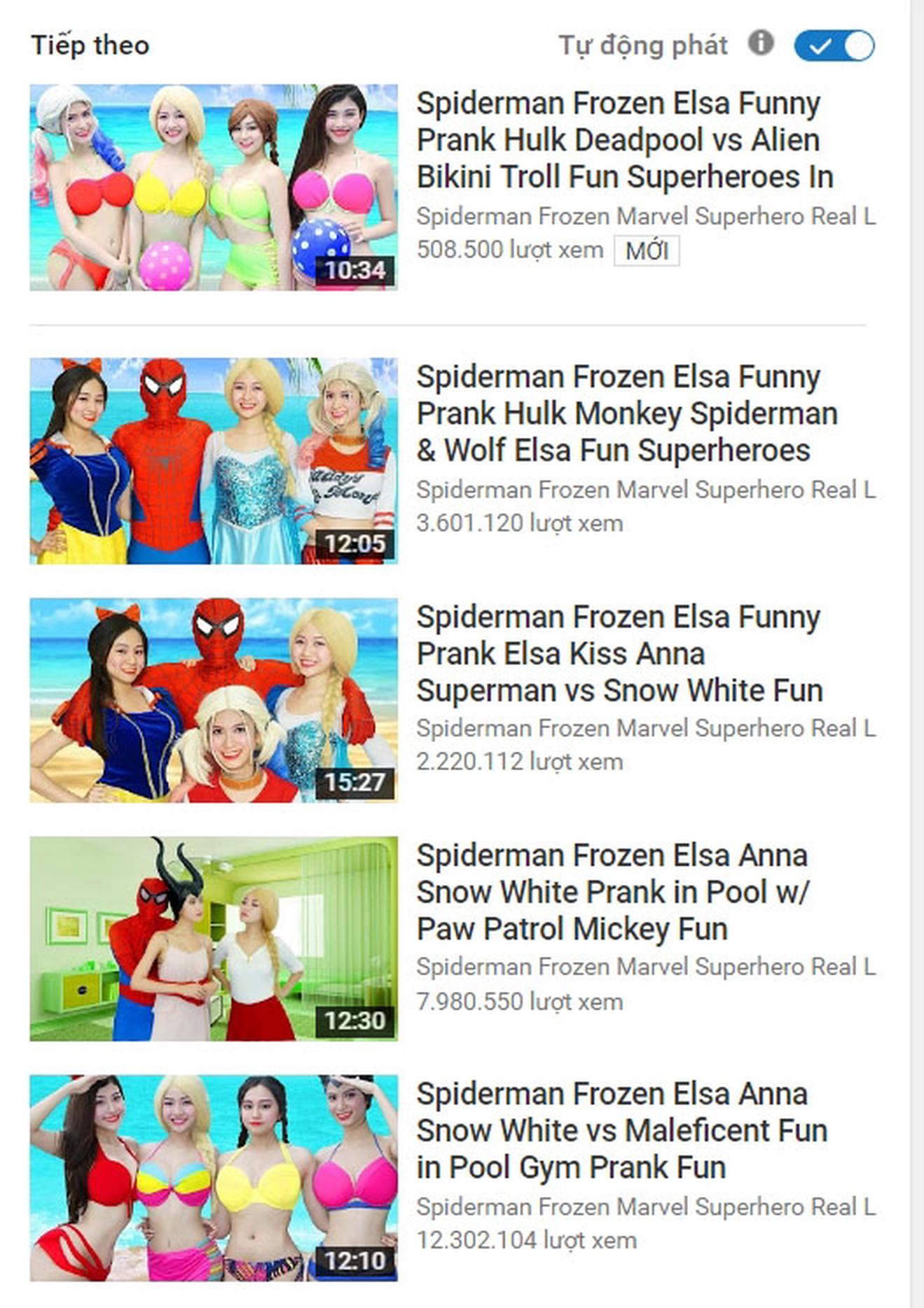 Nhiều kênh Youtube đã sử dụng các hình ảnh phản cảm, đồi trụy để câu view từ trẻ em. Kênh Youtube Elsa Spideman đang thu hút 1 lượng lớn trẻ em theo dõi bị đánh giá là như clip sex.