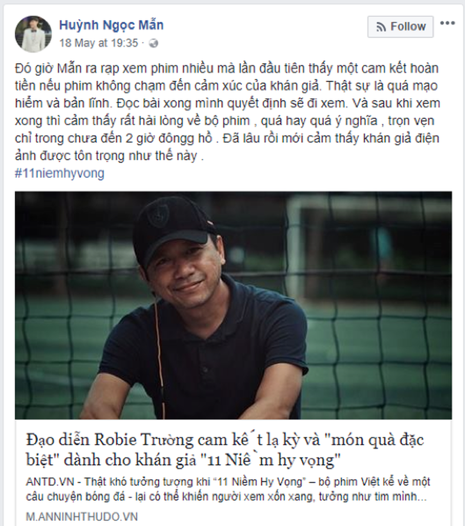 Đón nhận nhiều tình cảm nồng nhiệt của khán giả kể từ khi công chiếu, đặc biệt là sau lời cam kết hoàn vé nếu bộ phim không chạm đến trái tim khán giả, “11 Niềm Hy Vọng” thật sự đã truyền cảm hứng mạnh mẽ cho người hâm mộ, thậm chí cho cả những mọt phim vốn không phải là fan cuồng nhiệt của bóng đá Việt. Từng bước, “11 Niềm Hy Vọng” xây dựng niềm tin cho người hâm mộ vào điện ảnh nước nhà.