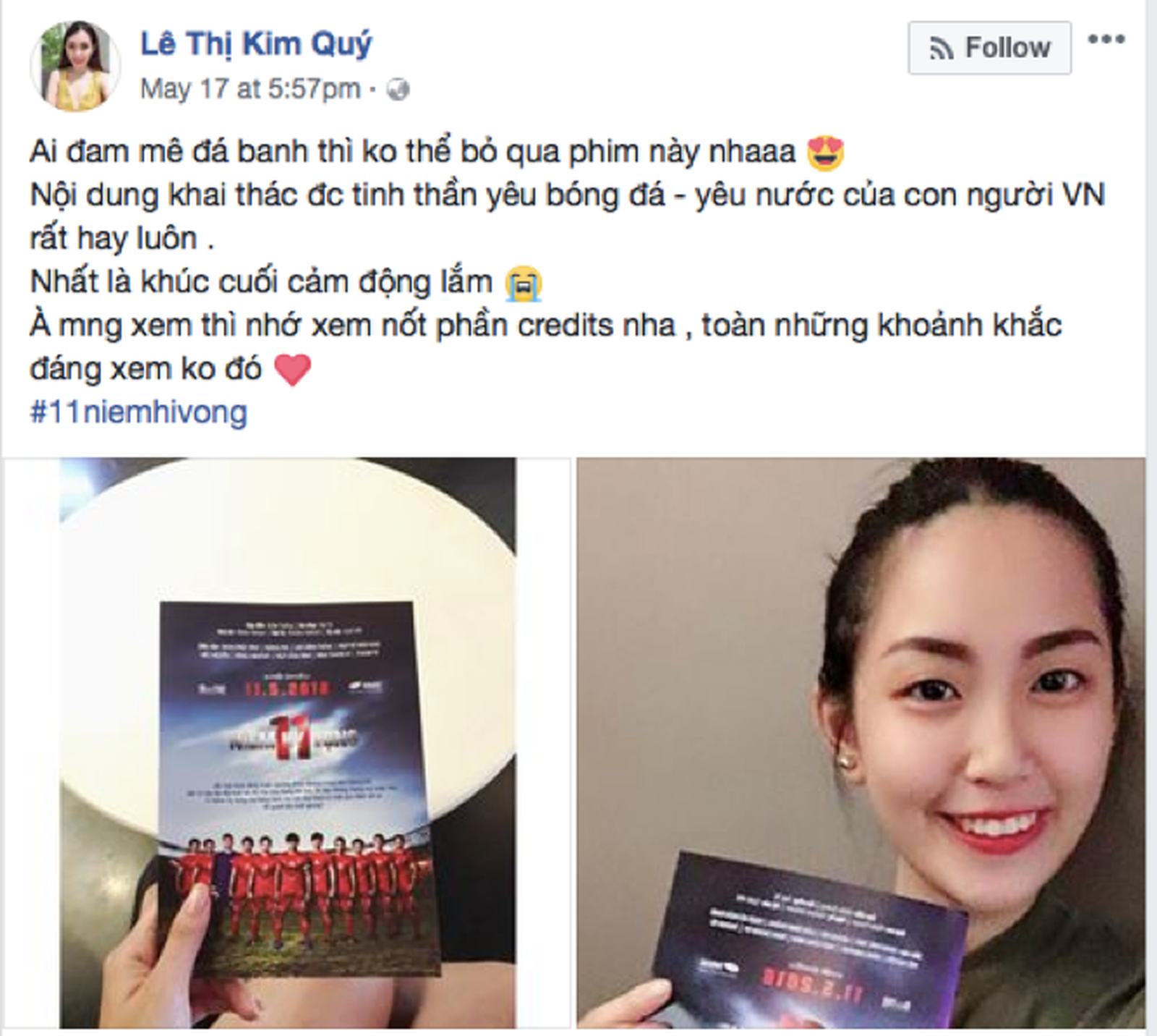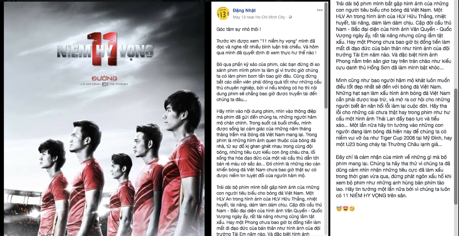 Một khán giả nữ đã chia sẽ cảm nhận xúc động sau khi xem phimFacebook Đặng Nhật có một bài chia sẻ rất sâu về cảm nhận của anh sau khi xem phim, anh viết “Trải dài bộ phim mình bắt gặp hình ảnh của những con người tiêu biểu cho bóng đá Việt Nam. Một HLV An trong hình ảnh của HLV Hữu Thắng, nhiệt huyết, tài năng, dám làm dám chịu. Cặp đôi cầu thủ Nam - Bắc đại diện của hình ảnh Văn Quyến - Quốc Vượng ngày ấy, rất tài năng nhưng cũng lắm tật xấu. Hay một Phong chưa bao giờ bị đồng tiền làm mất đi đạo đức của bản thân như hình ảnh của đội trưởng Tài Em năm nào. Và đặc biệt hình ảnh Phong nằm trên sân giơ tay trên trán chào như kiểu cựu danh thủ Hồng Sơn đã làm mình bật khóc...”Nhìn lại hành trình mà “11 Niềm Hy Vọng” đã đi qua, có thể thấy tình yêu bóng đá mãnh liệt của đạo diễn Robie Trường và ekip làm phim không phải là câu chuyện một sớm một chiều. “11 Niềm Hy Vọng” là tâm huyết và nỗ lực của 10 năm tìm hiểu và thu thập dữ liệu cũng như kiến thức bóng đá của chính đạo diễn và cả ekip."11 Niềm Hy Vọng" được tạo nên bởi một ekip dành nhiều tâm huyết cho bóng đá ViệtVới việc công chiếu trên kênh Youtube chính thức của Metan Entertainment, dù nơi bạn ở không có rạp chiếu phim, hoặc bạn đang ở một đất nước xa xôi nào đó, bạn hoàn toàn có thể thưởng thức trọn vẹn và một lần nữa sống trong không khí của những trận cầu nghẹt thở, tràn đầy niềm tin và tình yêu bóng đá được truyền tải trong bộ phim.Giờ thì bạn đã có thể xem miễn phí bộ phim “11 Niềm hy vọng” vào bất cứ lúc nào và ở bất cứ đâu tại địa chỉ: https://www.youtube.com/watch?v=_AtfNi-R6nE