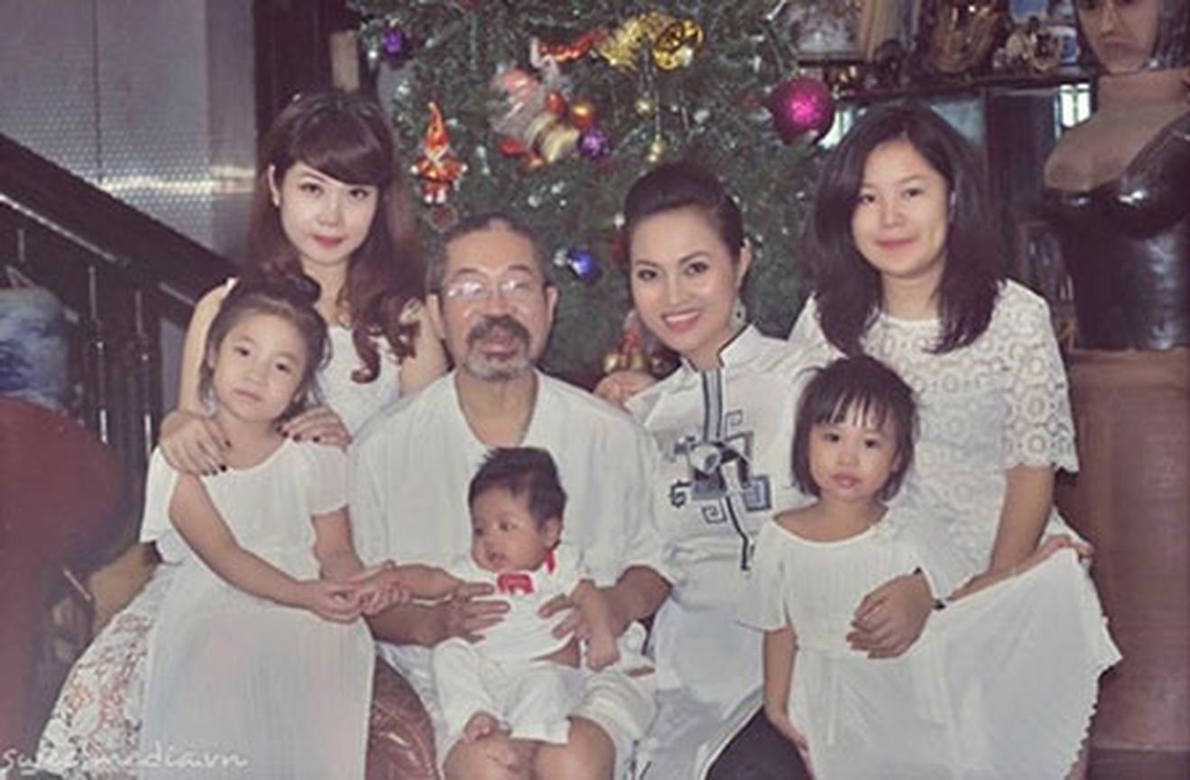 Ở tuổi 70 “gã đào hoa” Lê Hùng đang hạnh phúc bên cô vợ kém mình 32 tuổi - nghệ sĩ chèo Hoài Thu. Người vợ thứ sáu của ông không những cá tính mà còn có thân hình cao ráo, trắng trẻo. Trong ảnh là hình ảnh đại gia đình Lê Hùng được tiết lộ vào dịp đầy tháng con út.