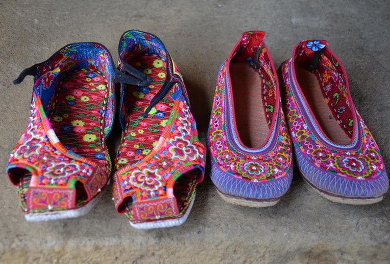 Giày thêu trong bộ trang phục của nam và nữ ở người dân tộc Xạ Phang. (Ảnh: Văn Dũng/TTXVN)