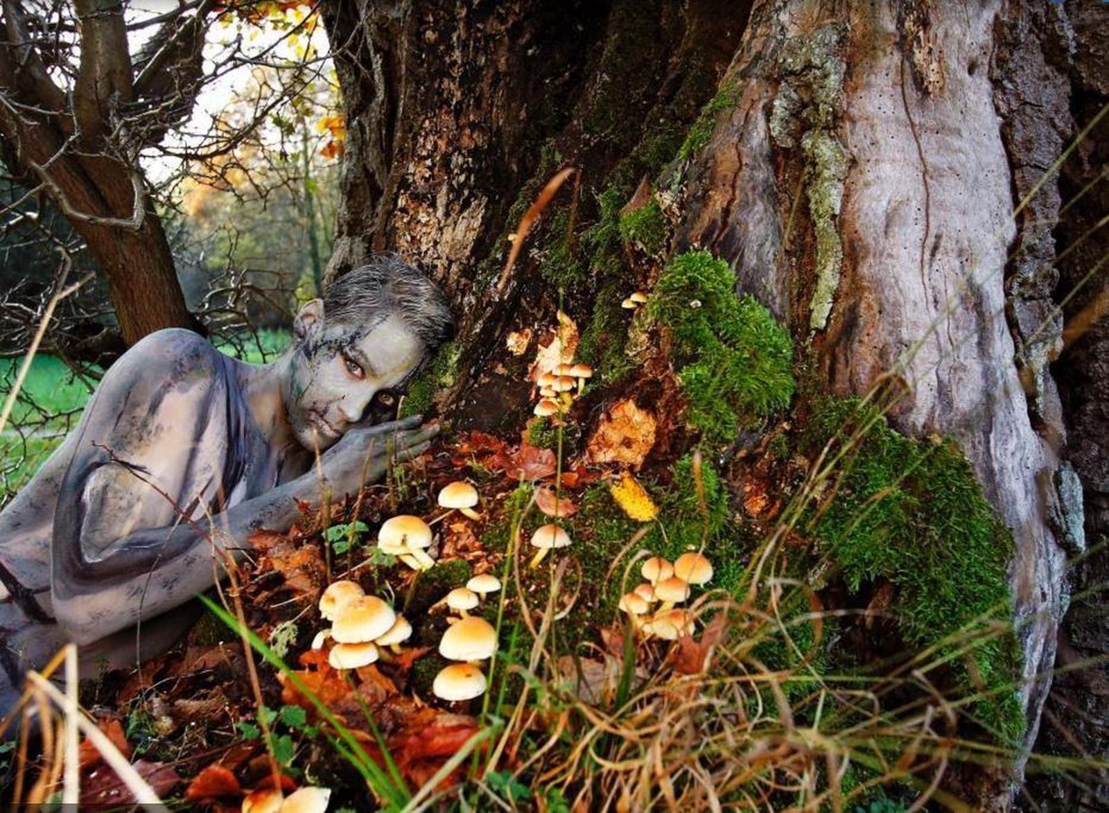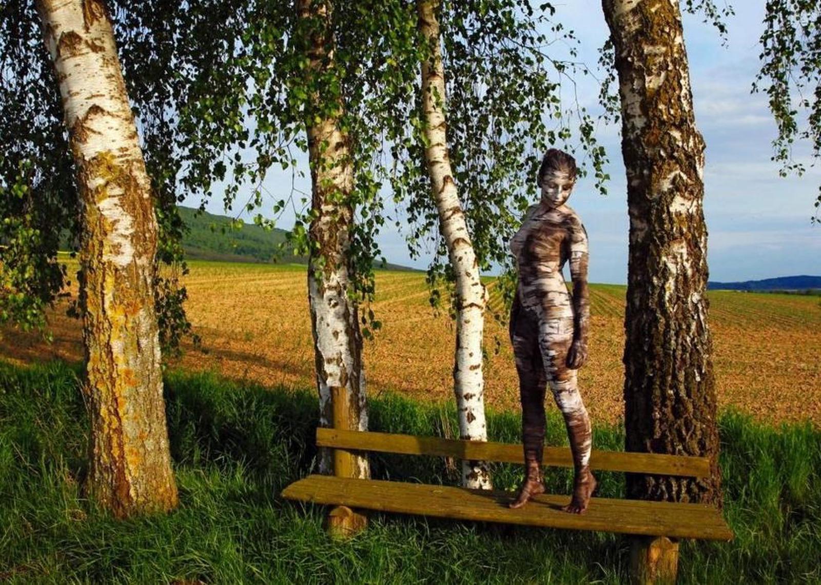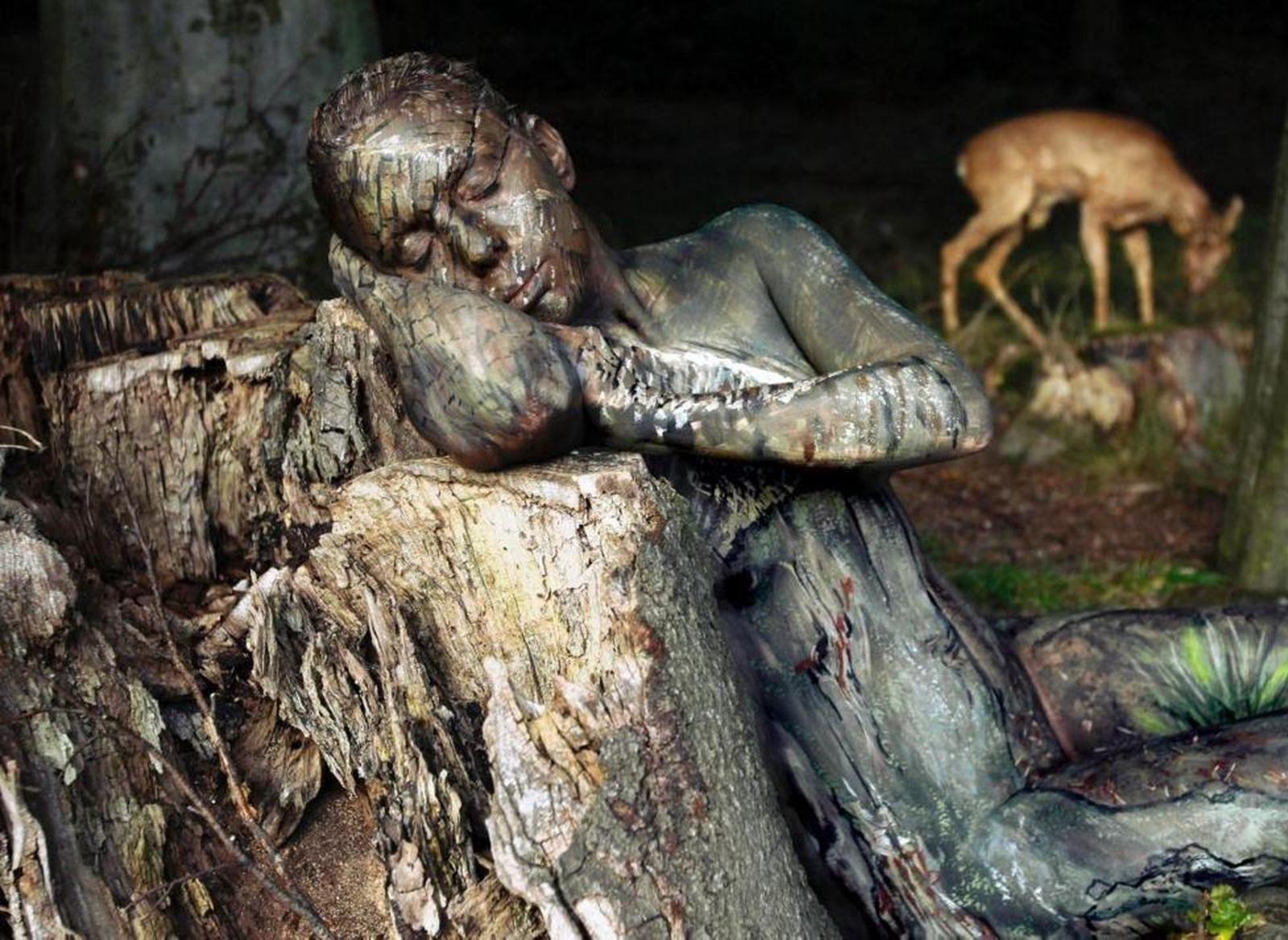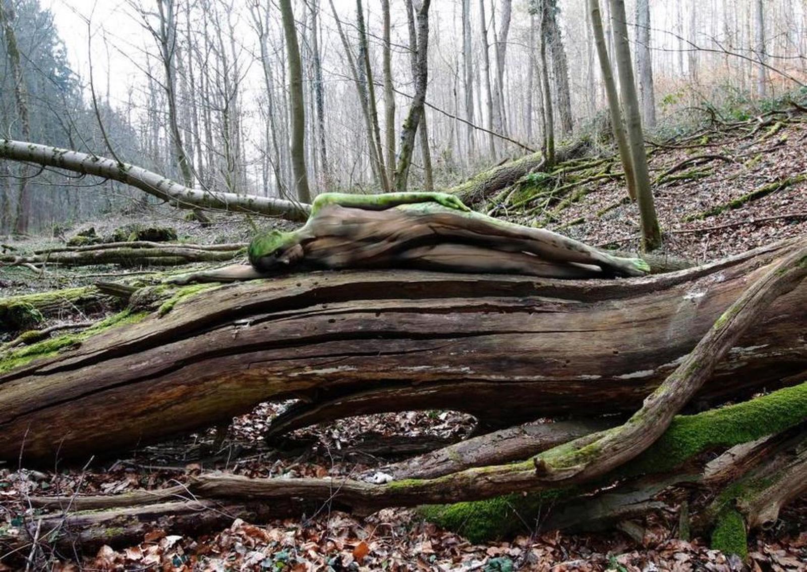Cô người mẫu được biến đổi để ăn nhập với thân cây khô. Vẻ đẹp này hoàn toàn phù hợp với chủ đề của bộ ảnh nghệ thuật của tự nhiên. Đây không phải là lần đầu tiên nghệ sỹ người Đức Jorg dùng hội họa để giấu những cô người mẫu vào thiên nhiên. Jorg rất giỏi trong việc giấu người mẫu ở mọi ngóc ngách trên thế giới. Ý tưởng độc đáo đã khiến anh nổi tiếng. Có sự khác biệt giữa những thân cây này. Jorge sáng tạo hình ảnh của người mẫu với màu sắc như của thân cây, sau đó để ẩn mình ở giữa cây và cỏ, màu sắc chuyển đổi rất tự nhiên. Một cô người mẫu khác đặt mình vào trong những thân cây đã chết cùng những đám rêu. Cô người mẫu này trong tư thế 'người đẹp ngủ trong rừng,Đám hoa nhiều màu sắc. Theo VIETNAM+
