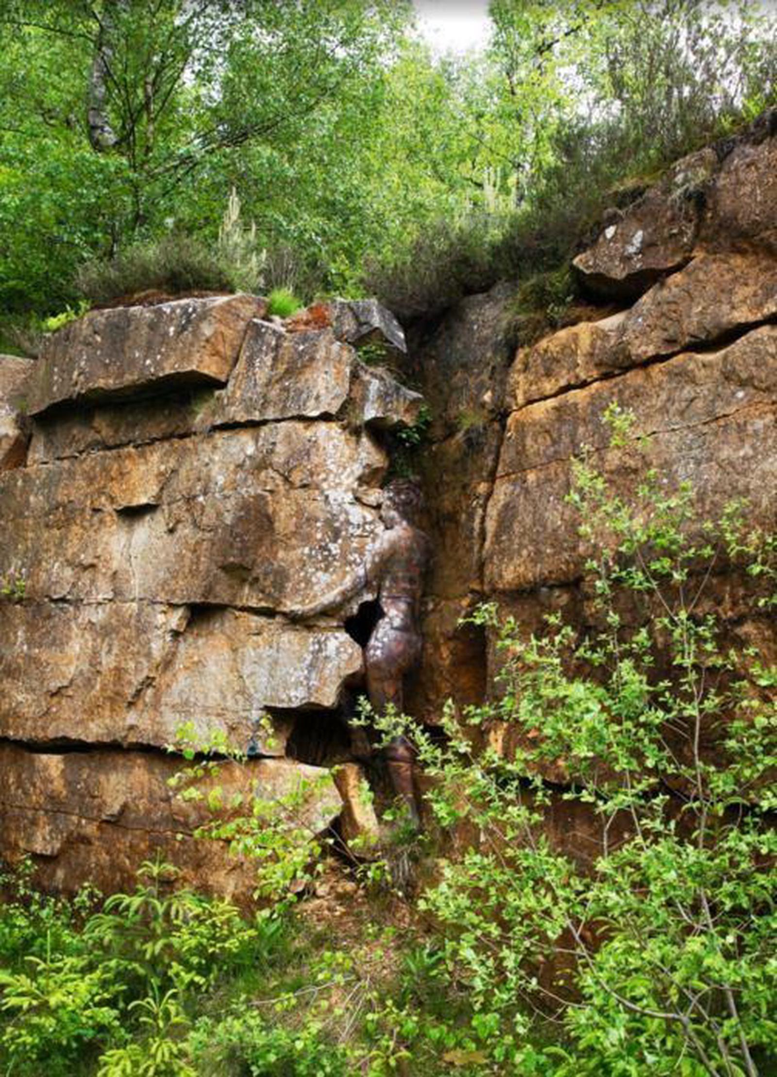 Người mẫu đứng giữa vách đá. Jorg đã vẽ lên cơ thể cô người mẫu những nét vẽ màu nâu, màu trắng.