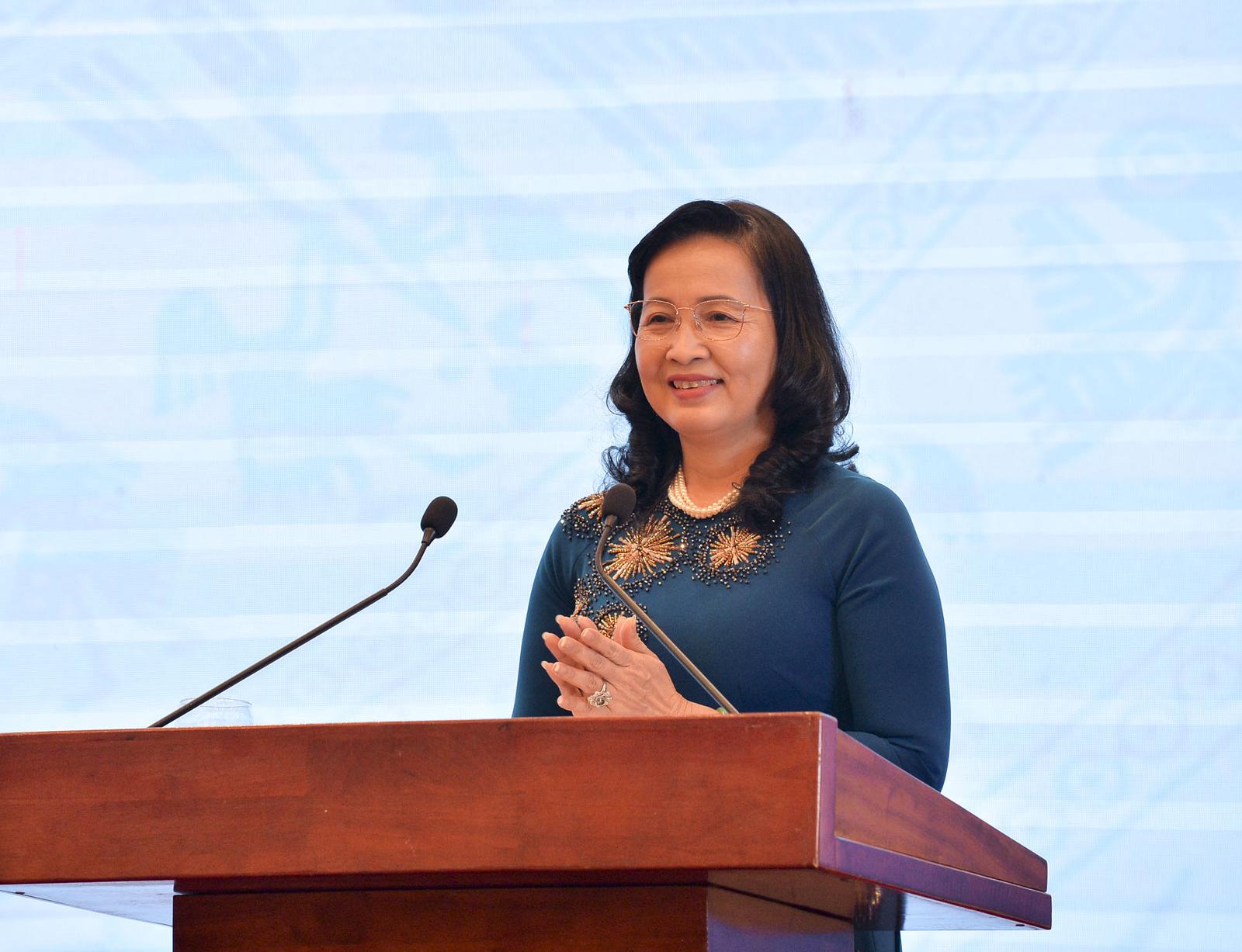 Bà Trần Thị Thu Đông - Chủ tịch Hội Nghệ sĩ Nhiếp ảnh Việt Nam phát biểu tại buổi lễ. Ảnh: TH