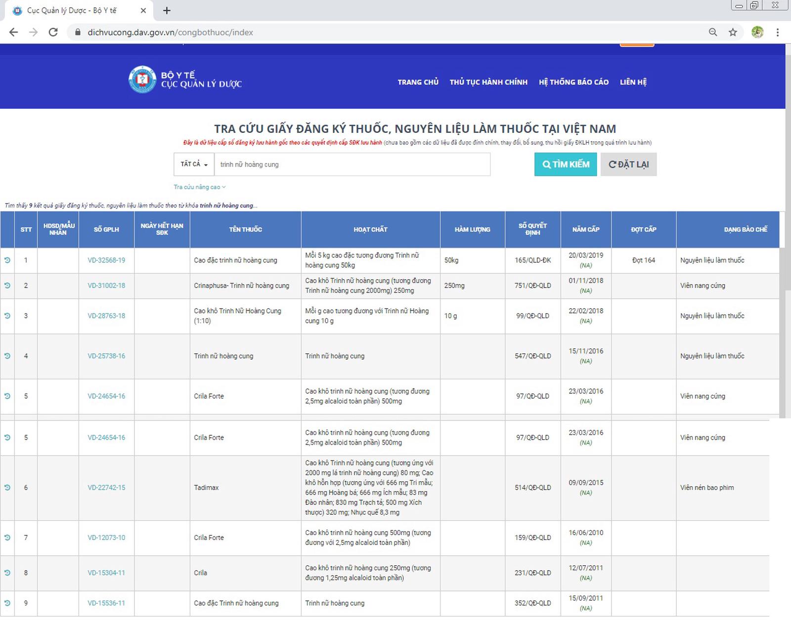 Theo tìm hiểu của chúng tôi, đã có 1 giải thưởng cấp Nhà nước cho cụm công trình “Nghiên cứu về cây trinh nữ hoàng cung Việt Nam (crinum latifolium) và theo giấy chứng nhận đăng ký quyền tác giả “Nghiên cứu đa hình di truyền tập đoàn các giống trinh nữ hoàng cung” thì ở Việt Nam có 7 cây Náng lá rộng thuộc loài Trinh nữ hoàng cung. 7 cây này đã được TS. Nguyễn Thị Ngọc Trâm nghiên cứu đa hình di truyền tập đoàn các giống Trinh nữ hoàng cung (7 giống) và phát hiện các đặc tính di truyền riêng biệt của cây Trinh nữ hoàng cung.Kết quả nghiên cứu của TS. Nguyễn Thị Ngọc Trâm cho thấy, 7 cây Náng lá rộng (người dân cũng gọi là Trinh nữ hoàng cung) có AND khác nhau. Do đó, thành phần hóa học khác nhau dẫn đến tác dụng sinh học cũng khác nhau. Các sản phẩm được sản xuất từ 7 cây Náng lá rộng (đều được gọi là Trinh nữ hoàng cung) cần phải được thử nghiệm lâm sàng theo qui định của Bộ Y tế trước khi được cấp số đăng ký thuốc.Cây Trinh nữ Crila (tên khoa học là Crinum latifolium L. var. crila Tram & Khanh) được Cty TNHH Thiên Dược nghiên cứu, thử nghiệm lâm sàng và xét duyệt đề cương thông qua Hội đồng đạo đức trong nghiên cứu y sinh học quốc gia để sản xuất ra thuốc Trinh nữ hoàng cung Crila. Kết quả thử nghiệm lâm sàng theo qui định của Bộ Y tế cho thấy thuốc an toàn, hiệu quả đối với người bệnh. Cây thuốc này đã được cấp Bằng bảo hộ giống cây trồng số 26.VN.2015 theo Quyết định số 332/QĐ-TT-VPBH ngày 15/7/2015 của Cục Trồng trọt – Bộ Nông nghiệp và Phát triển nông thôn, tác giả là TS. Nguyễn Thị Ngọc Trâm. Thời hạn bảo hộ là 20 năm tính từ ngày cấp bằng.Một chuyên gia sản xuất sản phẩm Trinh nữ hoàng cung Crila cũng cho biết, cây Trinh nữ hoàng cung Crila khi được Công ty TNHH Thiên Dược sử dụng làm nguyên liệu sản xuất thuốc còn cần được gieo trồng ở vùng thổ nhưỡng đảm bảo.Ảnh chụp kết quả tra cứu trên trên website của Cục Dược. Ảnh: PVTS. Nguyễn Thị Ngọc Trâm cho biết: "Với cương vị là chủ nhiệm đề tài cấp Nhà nước, chúng tôi đã làm hết sức mình để bảo hộ cho sản phẩm Trinh nữ hoàng cung. Do đó, Cty Phước Sanh Pharma không có nguyên liệu để sản xuất viên Crinaphusa mà sản xuất từ 1 cây Náng lá rộng khác cũng được gọi là Trinh nữ hoàng cung. Như vậy, đây là một sản phẩm thuốc mới cần phải thử nghiệm lâm sàng qua 3 giai đoạn. Khi có kết quả thử nghiệm lâm sàng, Cục quản lý Dược mới được cấp số đăng ký số thuốc cho sản phẩm.Tuy nhiên, Cty Phước Sanh Pharma chưa thử nghiệm lâm sàng mà đã được cấp số đăng ký thuốc 5 năm. Việc cấp số đăng ký thuốc cho sản phẩm Crinaphusa làm ảnh hưởng đến sức khỏe cộng đồng vì chưa được đánh giá tính an toàn và hiệu quả của thuốc.Điều đáng nói là, nếu Cục quản lý dược (Bộ Y tế) cấp số đăng ký cho sản phẩm Crinaphusa – Trinh nữ hoàng cung của Công ty Phước Sanh Pharma, sẽ có hàng loạt sản phẩm thuốc từ Trinh nữ hoàng cung nhưng không phải chiết xuất từ cây Crila, không được thử nghiệm lâm sàng, không an toàn, hiệu quả với người bệnh. Chưa kể, theo nghiên cứu khoa học, có dòng Náng lá rộng gây độc tố đối với sức khỏe con người, nhẹ thì gây độc trên gan, thận.Cty Phước Sanh Pharma đã dùng cây Náng lá rộng nào trong 7 cây (đều được người dân gọi là Trinh nữ hoàng cung) nêu trên? Cần phải nói thêm rằng, các cây này rất giống nhau về hình thái thực vật, khó phân biệt bằng mắt thường.Như vậy là đã rõ việc sản phẩm Crinaphusa Trinh nữ hoàng cung do Phước Sanh đường (hay Cty TNHH MTV Phước Sanh Pharma) sản xuất là có vấn đề về chất lượng. Thứ nhất, nguyên liệu để sản xuất ra sản phẩm này chưa được kiểm định an toàn cho người sử dụng và chưa tuân theo trình tự cần và đủ của một sản phẩm thuốc. Sản phẩm này khi được sản xuất và đưa ra thị trường bán là gây ảnh hưởng nghiêm trọng đến sức khỏe của người tiêu dùng. Thứ hai, sản phẩm này đang “mượn” số đăng ký của một sản phẩm khác. Ở một khía cạnh khác của vi phạm, dù là nhỏ nhất, Phước Sanh đường đang vi phạm về nguyên liệu sản xuất sản phẩm này!Làm việc với chúng tôi, TS. Trâm cũng cho biết, trong Đông y, sách của GS.TS. Đỗ Tất Lợi mới chỉ ra 1 bài thuốc có vị thành phần là vị lá Trinh nữ hoàng cung do một người quen của GS đưa nhưng chưa được kiểm chứng khoa học. Các sản phẩm được sản xuất từ 7 cây Náng lá rộng nêu trên (đều được gọi là Trinh nữ hoàng cung) cần phải thử nghiệm lâm sàng theo qui định của Bộ Y tế trước khi được cấp số đăng ký thuốc. Hiện, Việt Nam mới chỉ có sản phẩm Crila được nghiên cứu kỹ lưỡng từ dược thảo Việt Nam và là niềm tự hào trên thị trường dược phẩm trong nước và quốc tế. Đây cũng là sản phẩm được nghiên cứu trong 20 năm và được bảo hộ thương hiệu tại Việt Nam và các nước khác