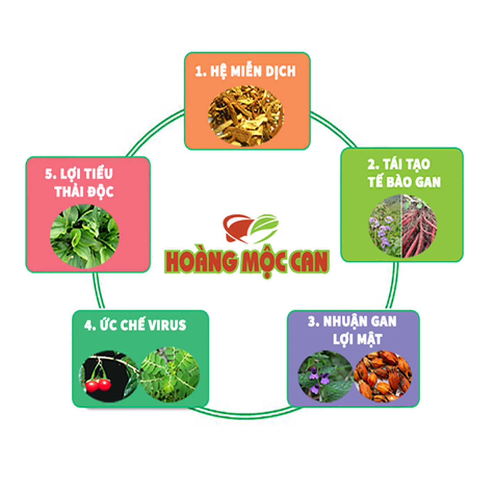 Các thảo dược phối hợp theo Phương pháp cân bằng có trong Hoàng Mộc Can được chia thành 5 nhóm.