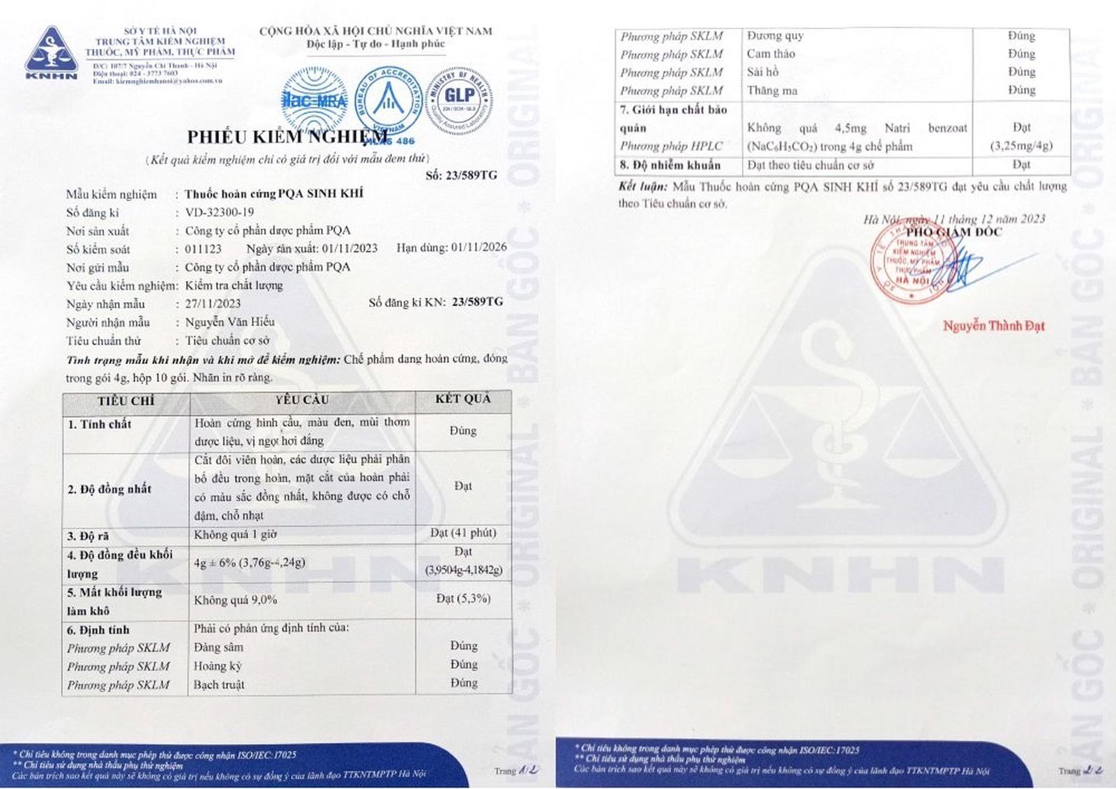Phiếu kiểm nghiệm của Sở Y Tế Hà Nội