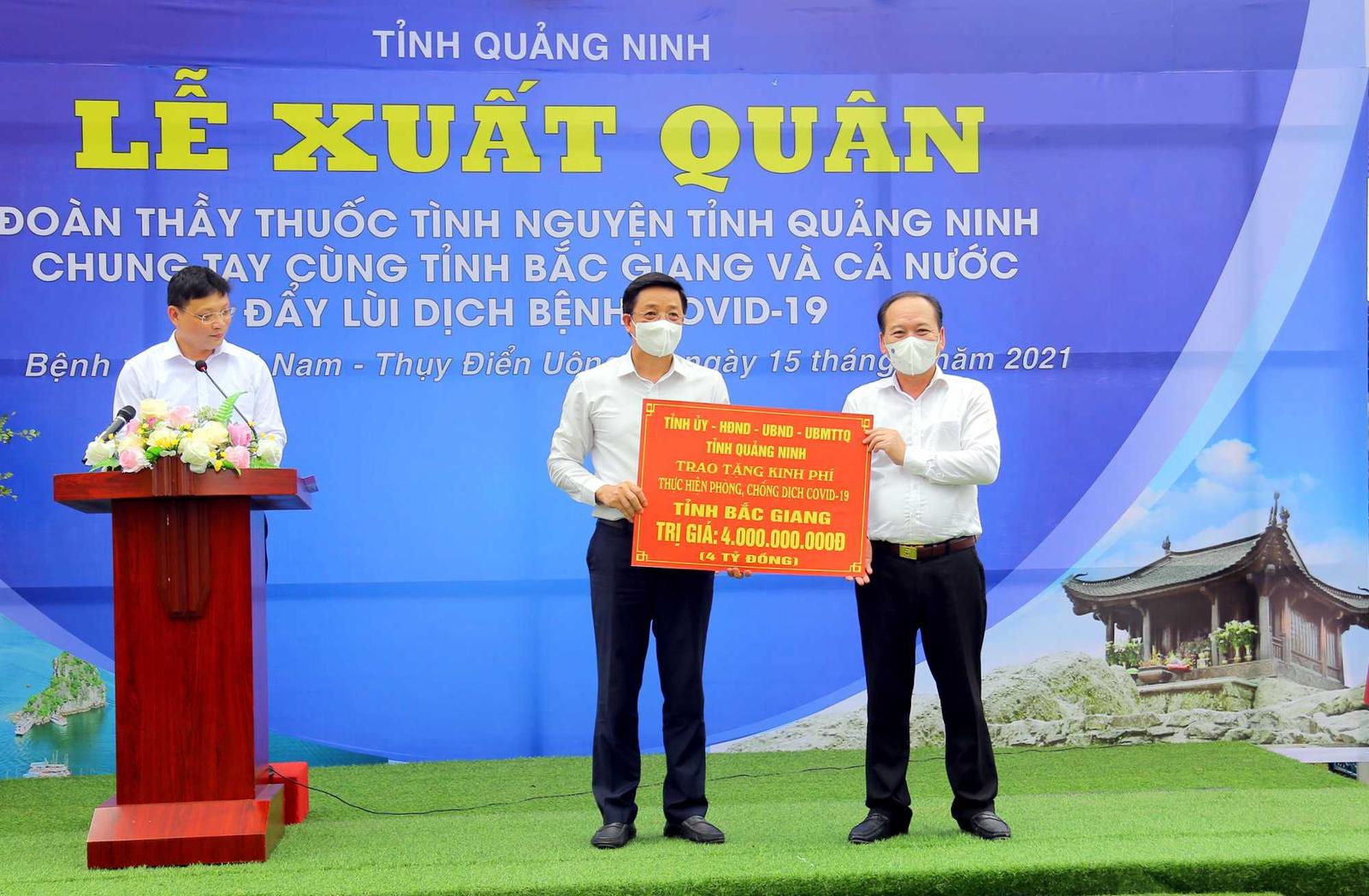 Nhân dịp này, tỉnh Quảng Ninh đã ủng hộ tỉnh Bắc Giang 4 tỷ đồng để phục vụ công tác phòng, chống dịch; Tổng Công ty Đông Bắc trao tặng tỉnh Bắc Giang 2 tỷ đồng.