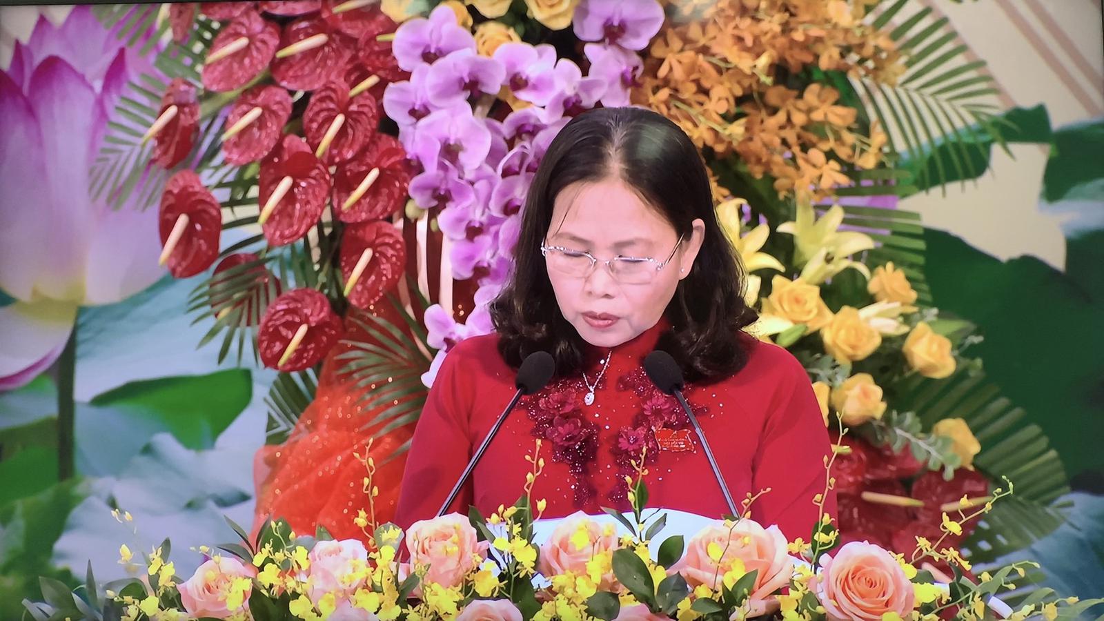 Bà Nguyễn Thị Yến, Phó Bí thư Thường trực Tỉnh ủy, Trưởng Đoàn ĐBQH tỉnh trình bày Báo cáo Chính trị tại Đại hội. (Ảnh: CT)