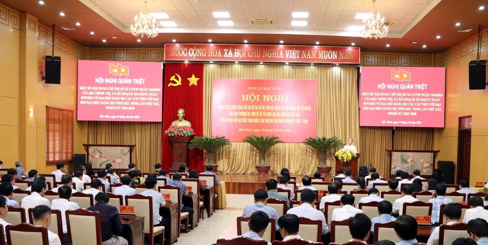 Sáng 15/10, Tỉnh uỷ Bắc Ninh tổ chức hội nghị quán triệt, triển khai Chỉ thị số 35-CT/TW của Bộ Chính trị và Kế hoạch số 152-KH/TU của Ban Thường vụ Tỉnh uỷ về tổ chức Đại hội Đảng bộ các cấp, tiến tới Đại hội Đại biểu toàn quốc lần thứ XIV của Đảng, nhiệm kỳ 2025-2030.