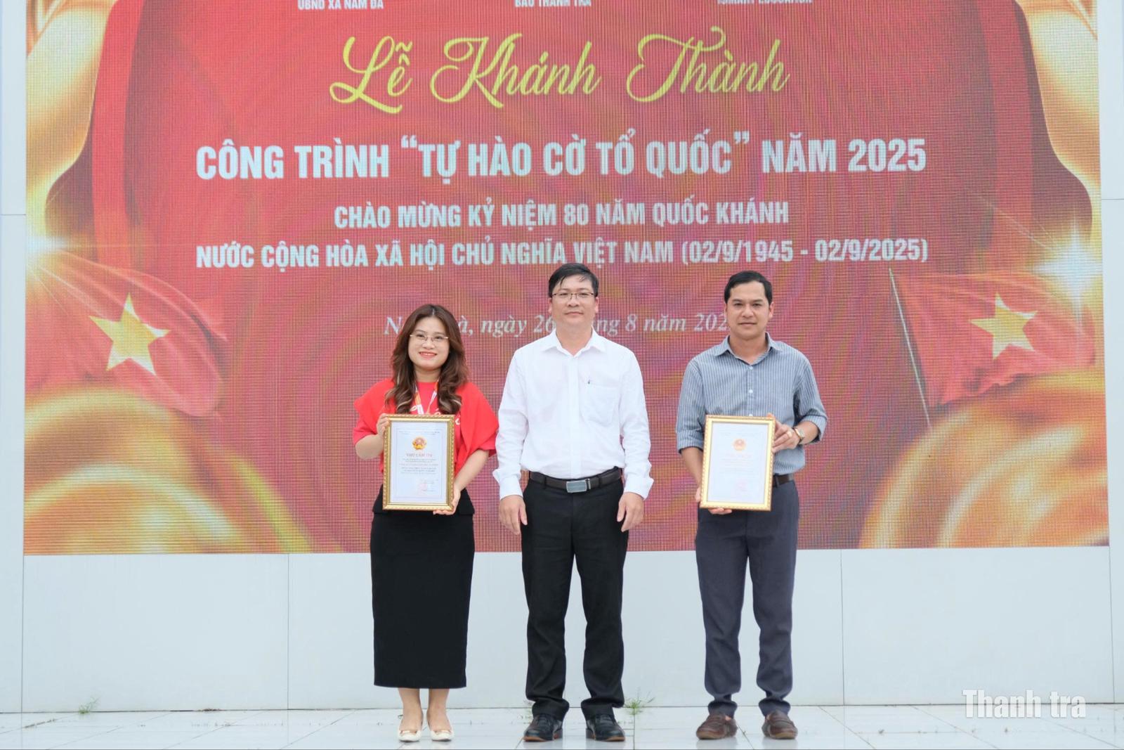 Đại diện Báo Thanh tra và Hệ thống Giáo dục ISMART trao bảng tượng trưng 1.000 lá cờ Tổ quốc cho lãnh đạo xã Nam Đà. Ảnh: NG