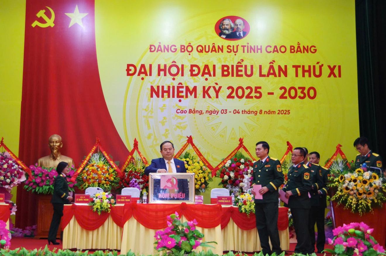 Đoàn Chủ tịch bỏ phiếu bầu Ban Chấp hành Đảng bộ Quân sự tỉnh Cao Bằng lần thứ XI, nhiệm kỳ 2025 - 2030. Ảnh: BCB