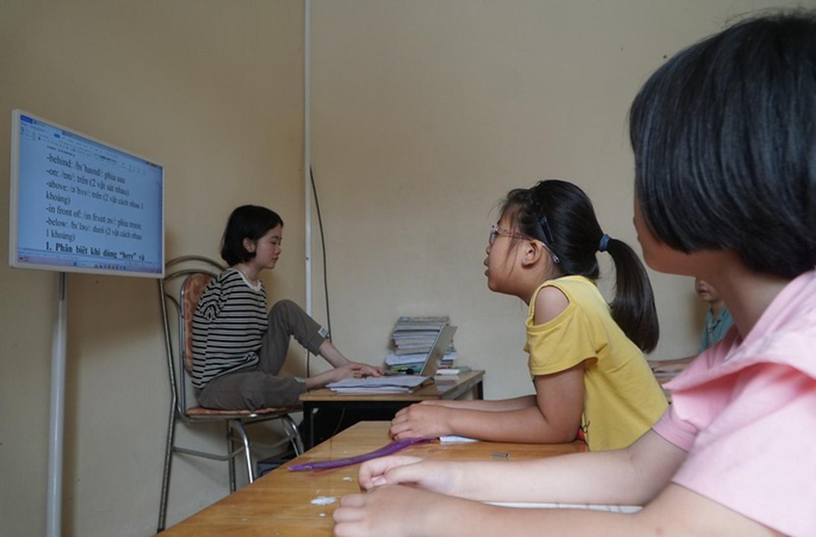 Cô giáo không tay dạy học cho các học sinh ở xã Đông Thịnh. Ảnh: VT