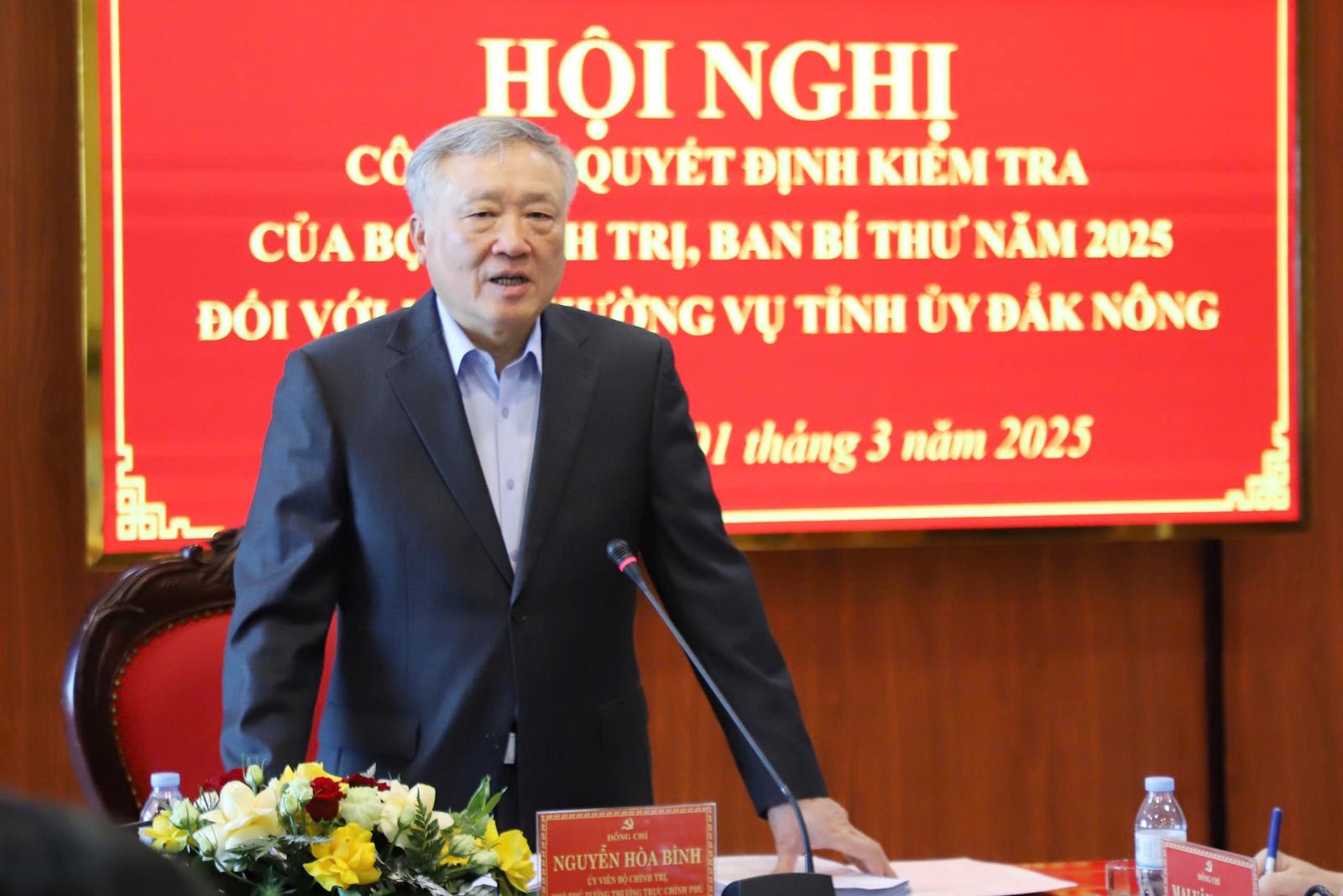 (Thanh tra) - Sáng 1/3, Phó Thủ tướng Thường trực Chính phủ Nguyễn Hòa Bình làm Trưởng đoàn Kiểm tra số 1923 công bố quyết định kiểm tra của Bộ Chính trị, Ban Bí thư năm 2025 đối với Ban Thường vụ Tỉnh ủy Đắk Nông.