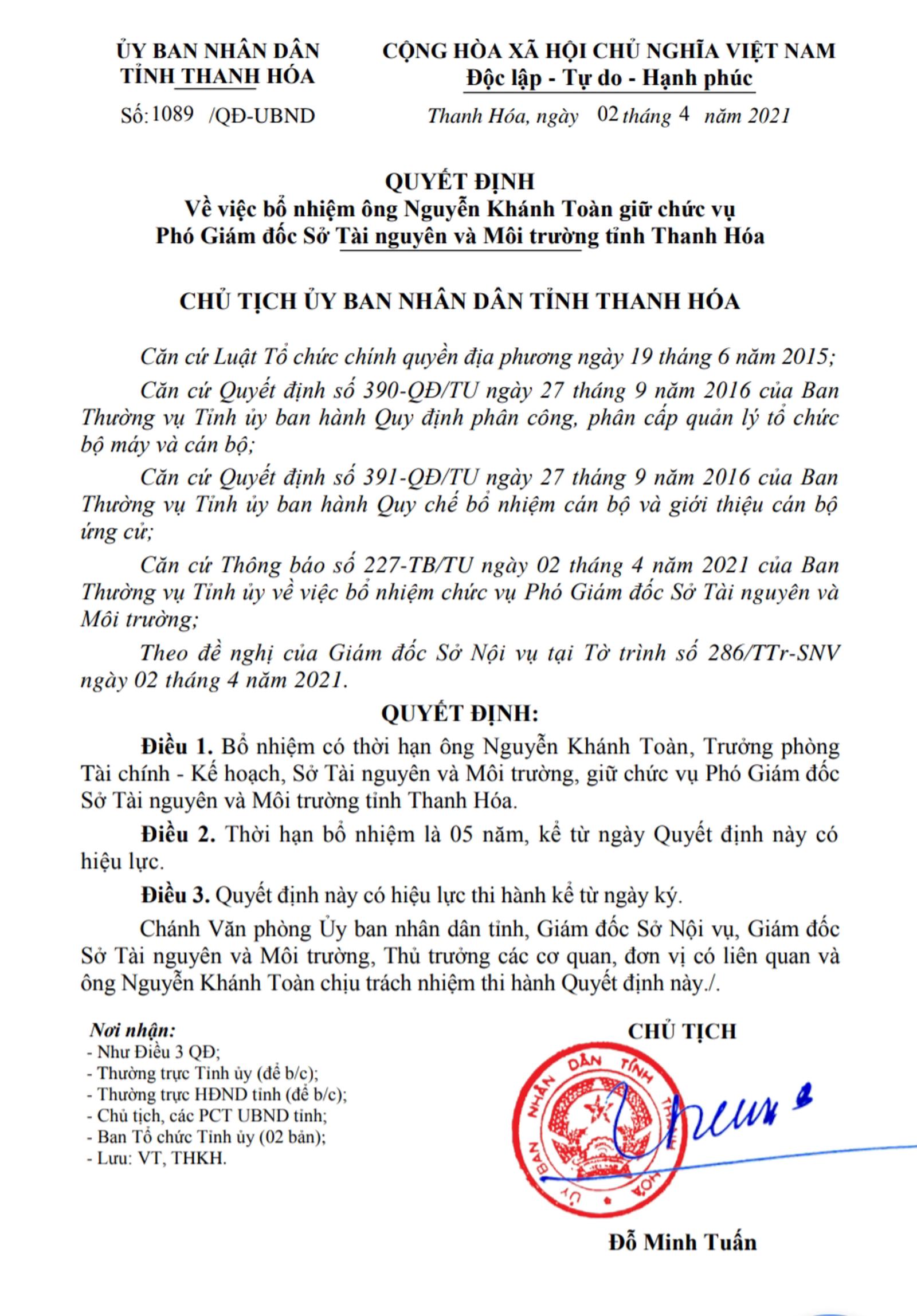 Ông Đỗ Minh Tuấn, Chủ tịch UBND tỉnh Thanh Hóa vừa có Quyết định số 1089/QĐ-UBND và Quyết định 1098/QĐ-UBND bổ nhiệm có thời hạn 5 năm đối với ông Phạm Văn Hoành, Trưởng phòng Tài nguyên Khoáng sản và ông Nguyễn Khánh Toàn, Trưởng phòng Tài chính thuộc Sở Tài nguyên và Môi trường tỉnh Thanh Hóa giữ chức vụ Phó Giám đốc Sở Tài nguyên và Môi trường tỉnh Thanh Hóa.