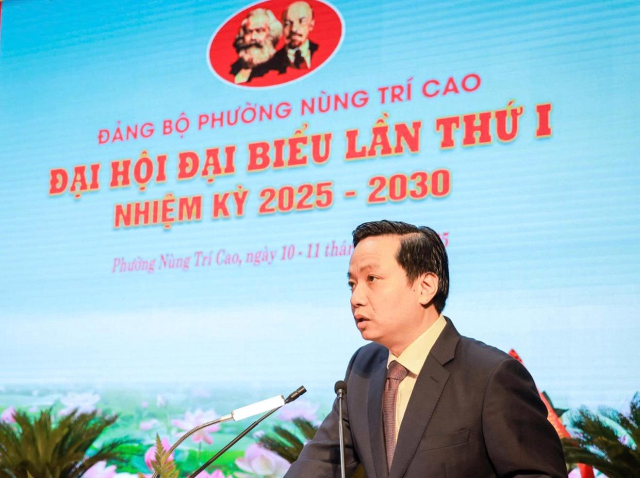 Phát biểu chỉ đạo Đại hội, Chủ tịch UBND tỉnh Cao Bằng Lê Hải Hoà nhấn mạnh nhiệm kỳ 2025 - 2030, để đạt được mục tiêu xây dựng phường Nùng Trí Cao trở thành phường đô thị văn minh, phát triển toàn diện, đời sống Nhân dân được nâng cao, đề nghị xây dựng Đảng bộ thật sự trong sạch, vững mạnh - kiên định về chính trị, chặt chẽ về tổ chức, gương mẫu về đạo đức. Đào tạo, bồi dưỡng cán bộ; khuyến khích sáng tạo, dám nghĩ, dám làm, dám chịu trách nhiệm vì lợi ích chung. Bứt phá kinh tế dựa trên lợi thế trung tâm, hạ tầng cao tốc, cửa khẩu và logistics. Phát triển thương mại - dịch vụ, kinh tế đêm, chợ phiên, phố đi bộ, tuyến phố ẩm thực; khai thác giá trị Đền Kỳ Sầm, Đền Bà Hoàng, sông Bằng để phát triển du lịch văn hóa và cộng đồng. Phát triển văn hóa - giáo dục - y tế đồng bộ. Xây dựng trường chuẩn, nâng cao chất lượng giáo dục; đẩy mạnh chuyển đổi số; nâng cao dịch vụ y tế, chăm sóc sức khỏe Nhân dân; bồi đắp công dân văn minh, mến khách, tự hào gìn giữ bản sắc Tày - Nùng. Giữ vững quốc phòng, an ninh, nắm chắc tình hình, xử lý nhanh các vấn đề phát sinh, tạo môi trường an toàn, thân thiện để thu hút đầu tư, phát triển sản xuất. Nâng cao đời sống Nhân dân, tăng thu nhập, bảo đảm an sinh, giữ gìn môi trường sống trong lành; thực hiện giảm nghèo bền vững; xây dựng nông thôn mới, đô thị văn minh.
