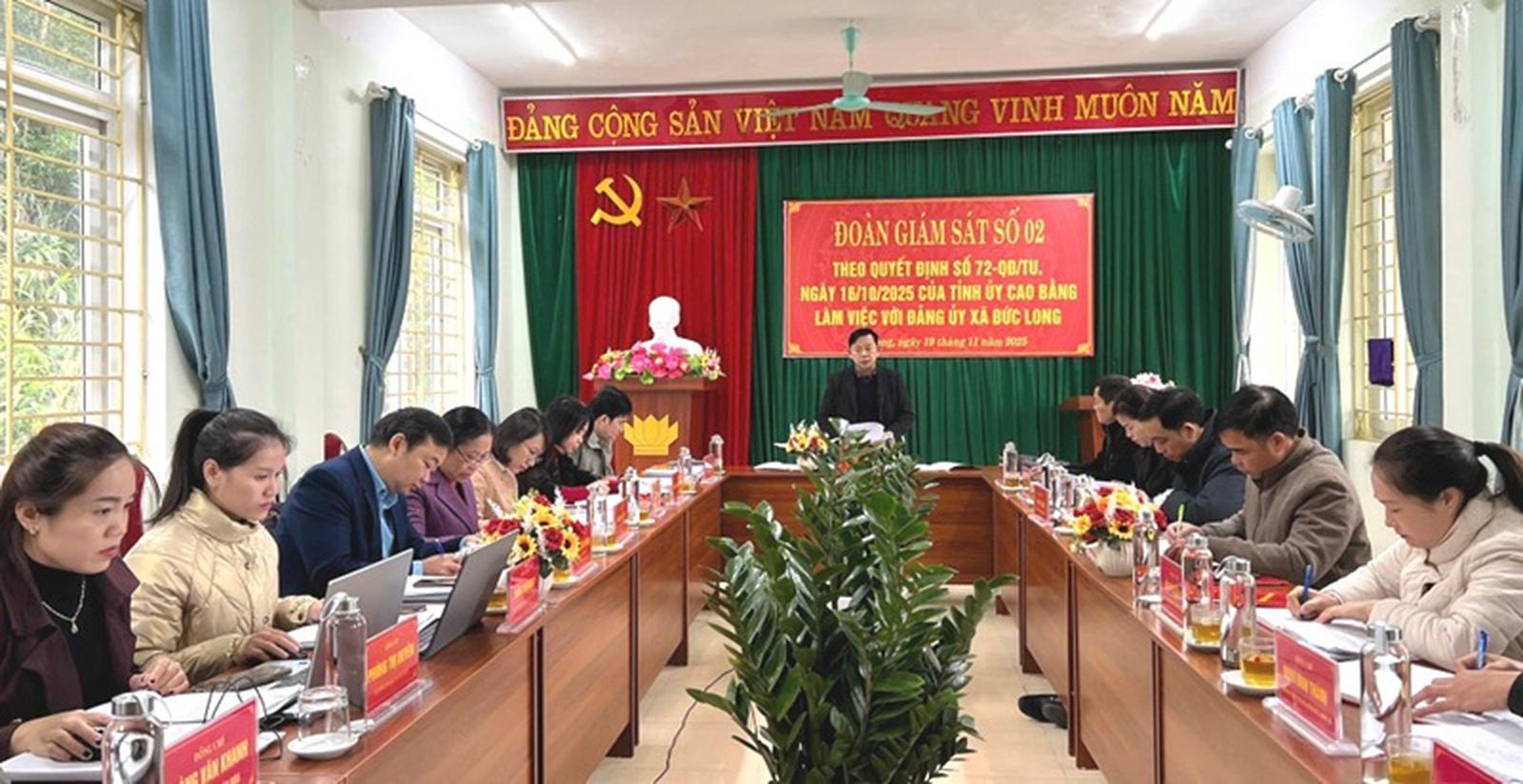 Cùng ngày, Đoàn giám sát số 2 của Tỉnh ủy Cao Bằng do Phó Chủ nhiệm Thường trực Ủy ban Kiểm tra Tỉnh ủy Lã Hoài Nam làm Trưởng đoàn làm việc với Đảng ủy xã Đức Long. Đảng ủy xã có 27 chi bộ trực thuộc với 588 đảng viên. Từ khi thực hiện mô hình chính quyền địa phương 2 cấp và tổ chức Đại hội Đảng bộ xã lần thứ I, Ban Thường vụ Đảng ủy đã lãnh đạo toàn diện, ban hành 147 văn bản chỉ đạo, điều hành; xây dựng chương trình kiểm tra, giám sát; phân công nhiệm vụ cho cấp ủy; chỉ đạo thành công Đại hội Đảng bộ xã.