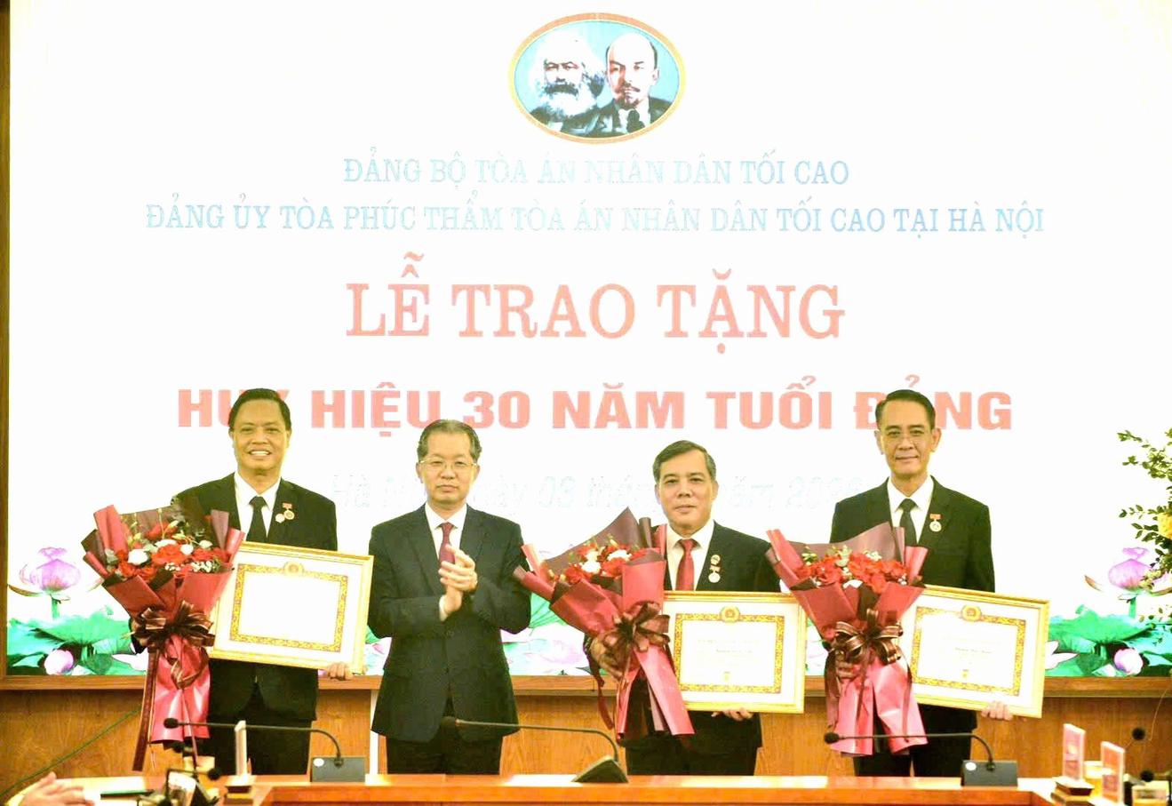 Chánh án TAND Tối cao Nguyễn Văn Quảng trao Huy hiệu 30 năm tuổi Đảng cho ba đảng viên. Ảnh: MH