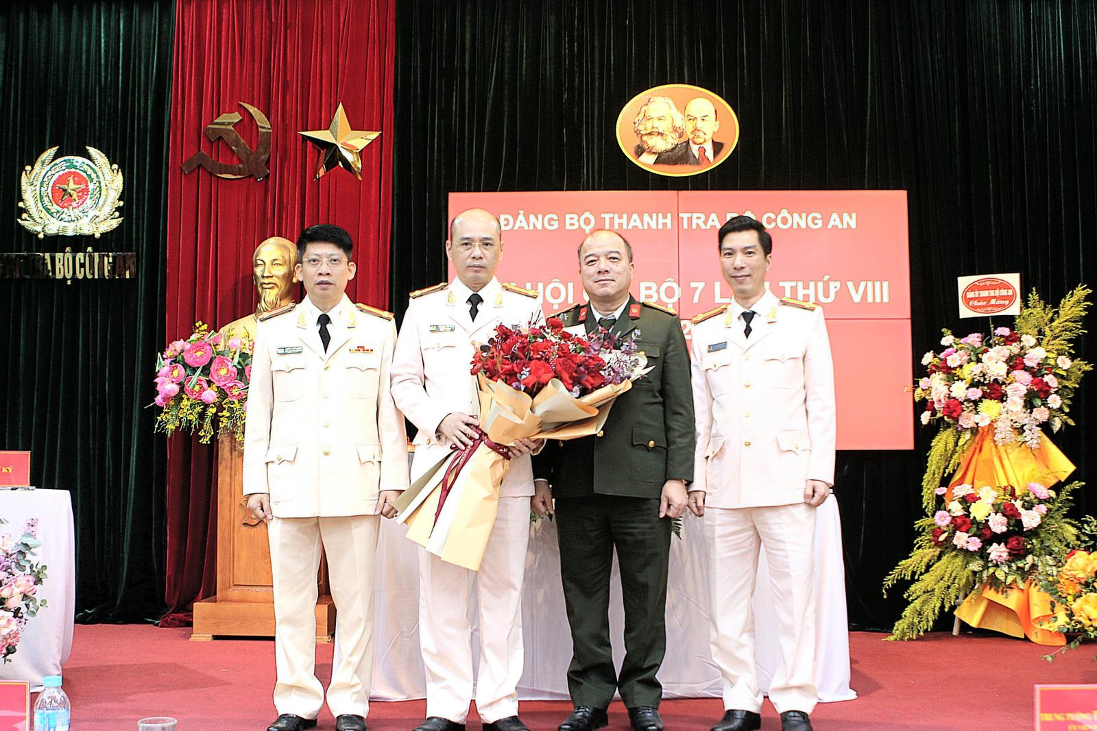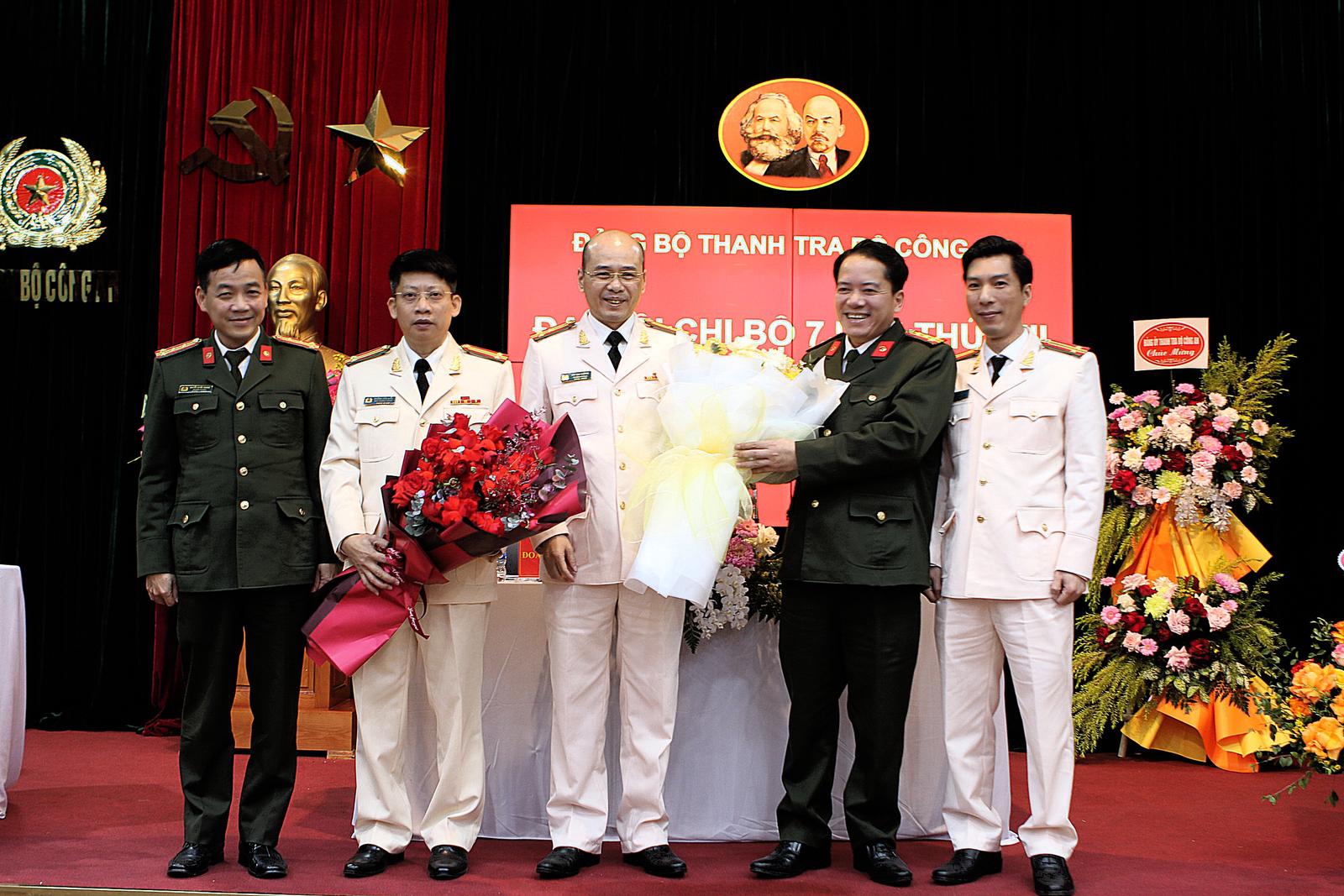 Đại tá Trần Văn Thư, Phó Chánh Thanh tra Bộ Công an tặng hoa, chúc mừng Chi ủy Chi bô 7 nhiệm kỳ 2025-2027. Ảnh: Hoàng Nam