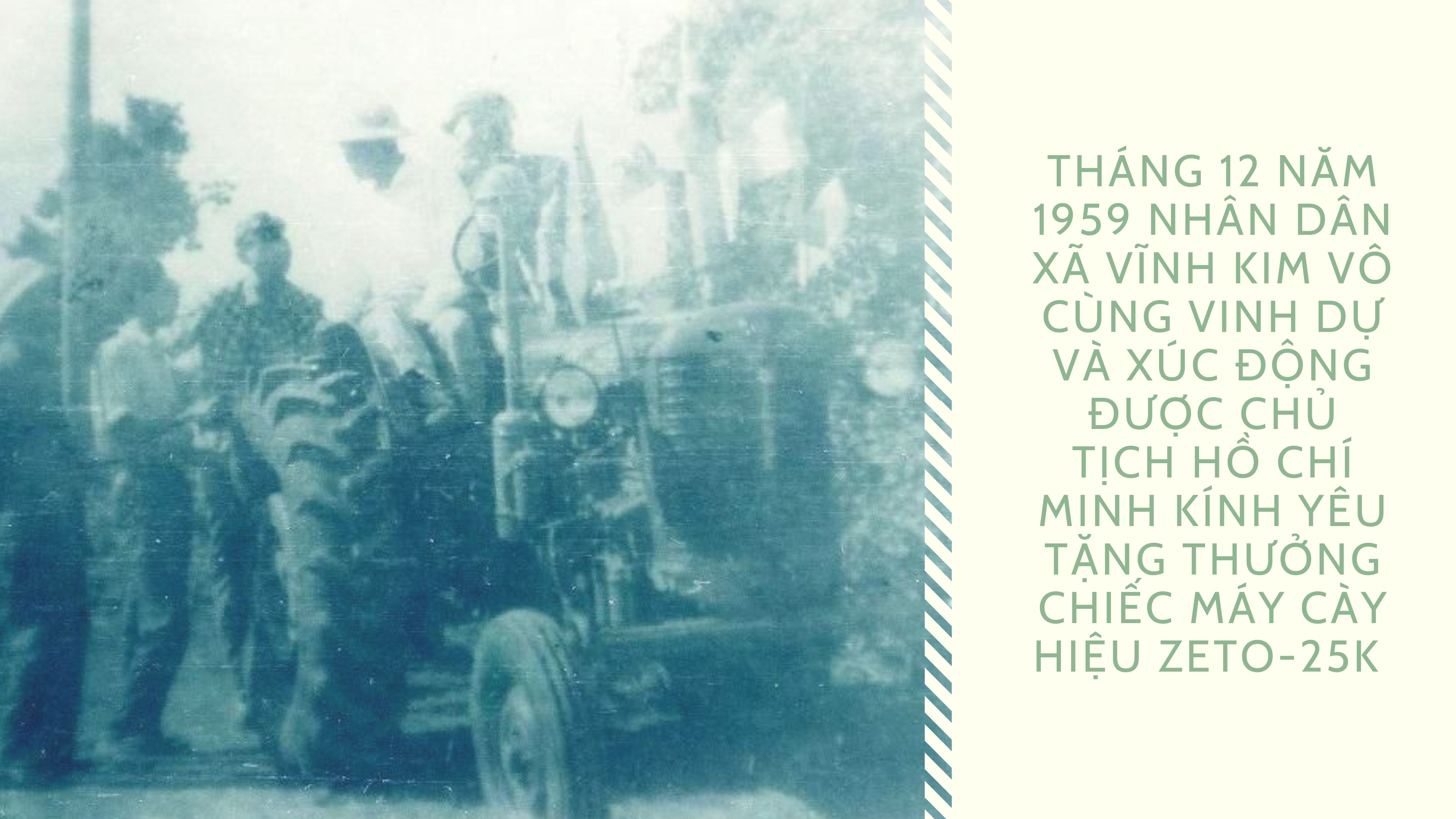 Với những thành tích xuất sắc đóng góp cho xây dựng chủ nghĩa xã hội, tháng 12 năm 1959 HTX nông nghiệp, cán bộ và nhân dân xã Vĩnh Kim vô cùng vinh dự và xúc động được Chủ tịch Hồ Chí Minh kính yêu tặng thưởng chiếc máy cày hiệu Zeto-25K của nước bạn Tiệp Khắc gửi tặng Người.