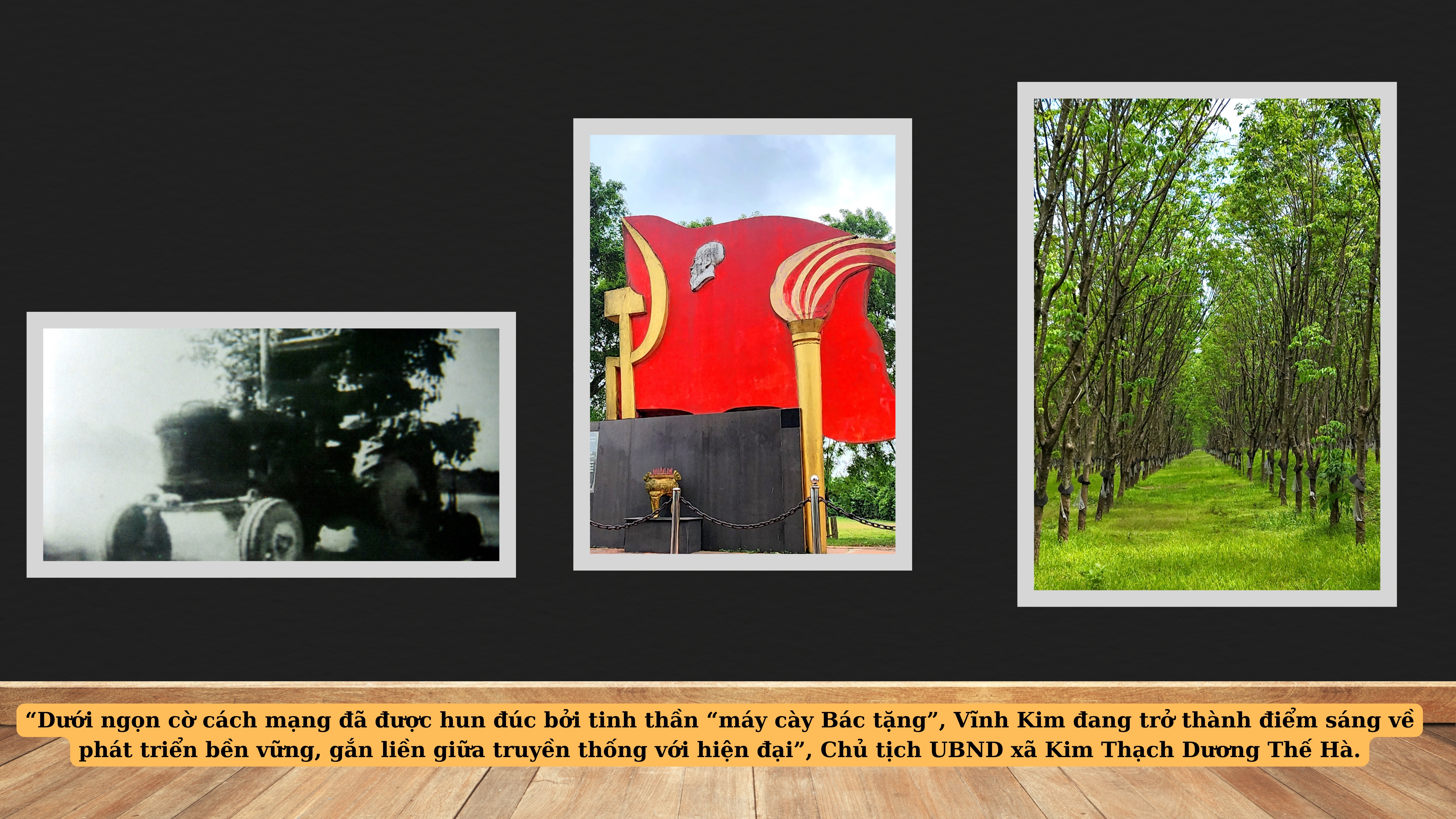 Chủ tịch UBND xã Kim Thạch Dương Thế Hà tự hào: “Những mô hình sản xuất nông nghiệp công nghệ cao, HTX kiểu mới, được nhân rộng không ngừng. Dưới ngọn cờ cách mạng đã được hun đúc bởi tinh thần “máy cày Bác tặng”, Vĩnh Kim đang trở thành điểm sáng về phát triển bền vững, gắn liền giữa truyền thống với hiện đại”.
