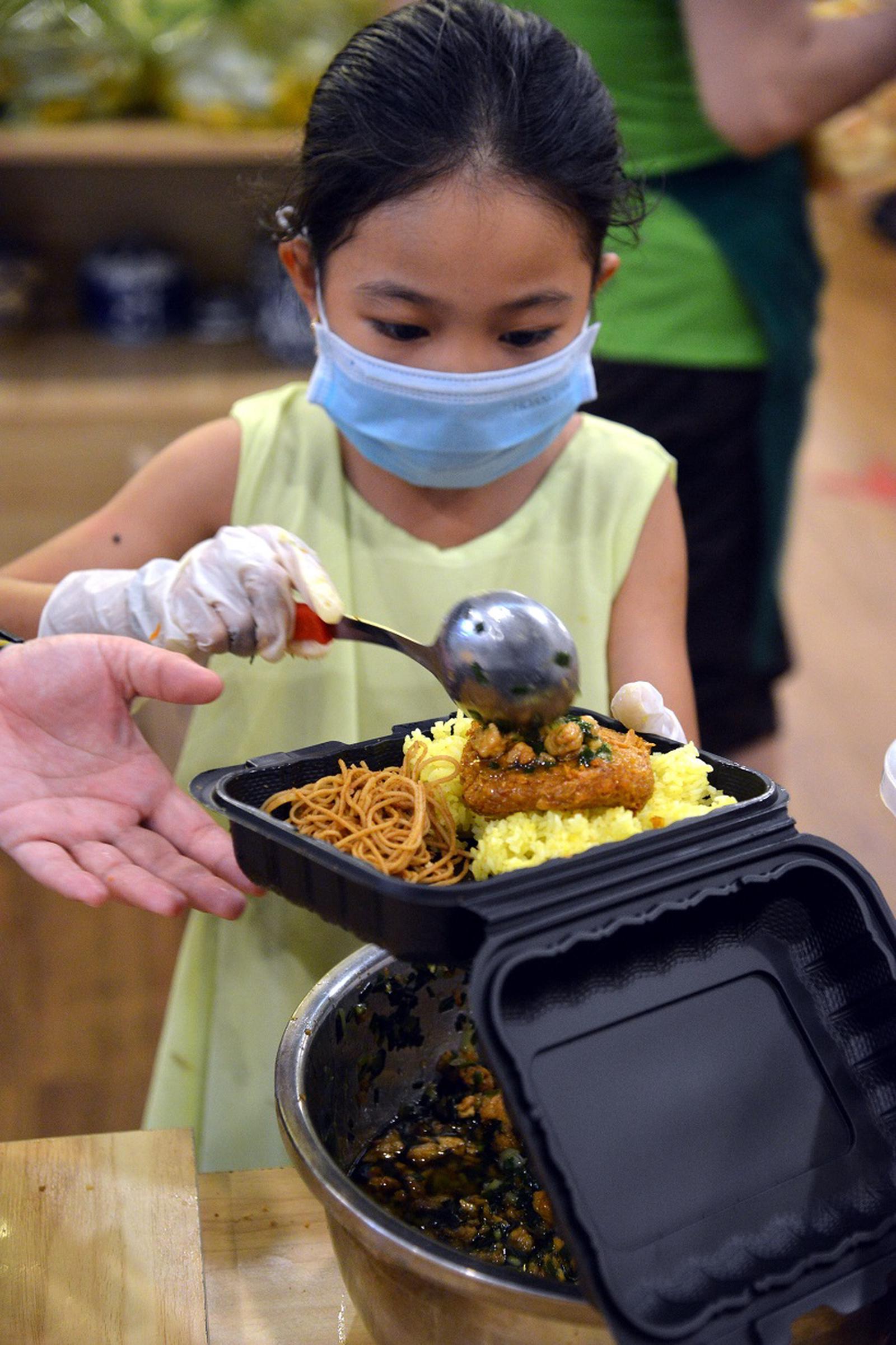 Vừa xắt bắp cải, sơ bào cà rốt, khoai tây xong, thoáng một cái, bé Như đã chạy ra vào trong bếp ngồi phụ các tình nguyên viên khác buộc mấy bịch nước mắm với thao tác rất nhanh nhẹn. Đến gần trưa, cô bé lại đến khu vực chia đồ ăn vào những hộp cơm nóng hổi để kịp gửi đến các chiến sĩ tuyến đầu chống dịch và khu phong tỏa, cách ly.
