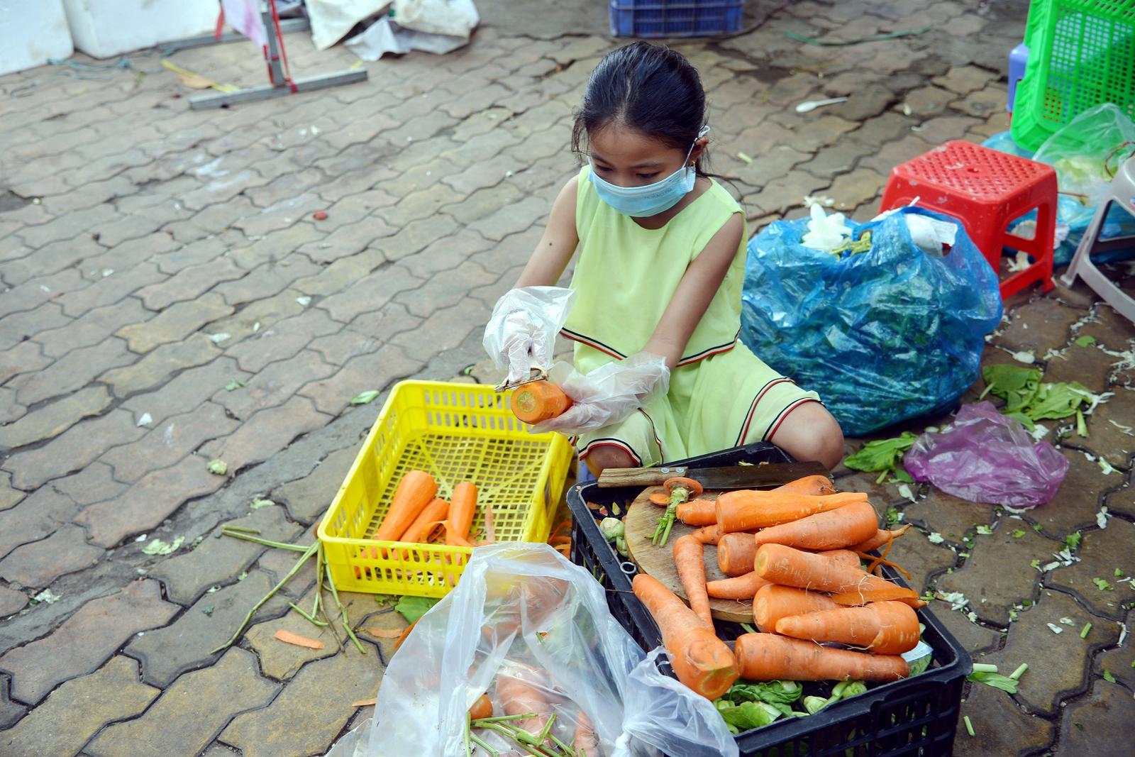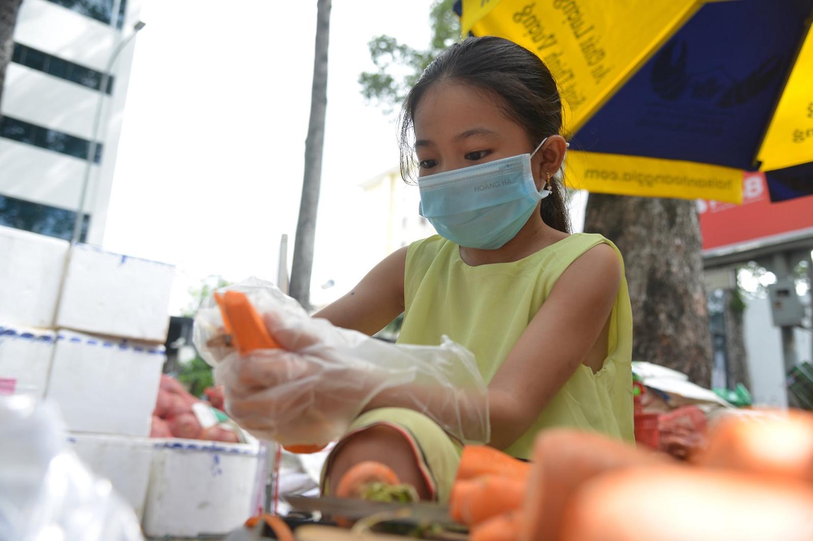 Từ rất sớm, bé Quỳnh Như cùng cậu ruột đến bếp ăn thiện nguyện Mãn Tự (201 Nguyễn Thị Minh Khai, quận 1, TP HCM) cùng mọi người tiến hành sơ chế rau củ quả để kịp chế biến thành hơn 5.000 suất cơm gửi miễn phí đến các chiến sĩ nơi tuyến đầu chống dịch và người dân trong khu phong tỏa cách ly trên địa bàn thành phố.