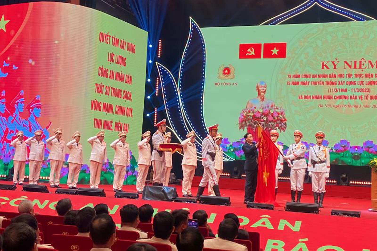 Chủ tịch nước Võ Văn Thưởng gắn Huân chương Bảo vệ Tổ quốc hạng Nhất lên Cờ Truyền thống của Lực lượng Xây dựng lực lượng CAND. Ảnh: Thanh Thanh