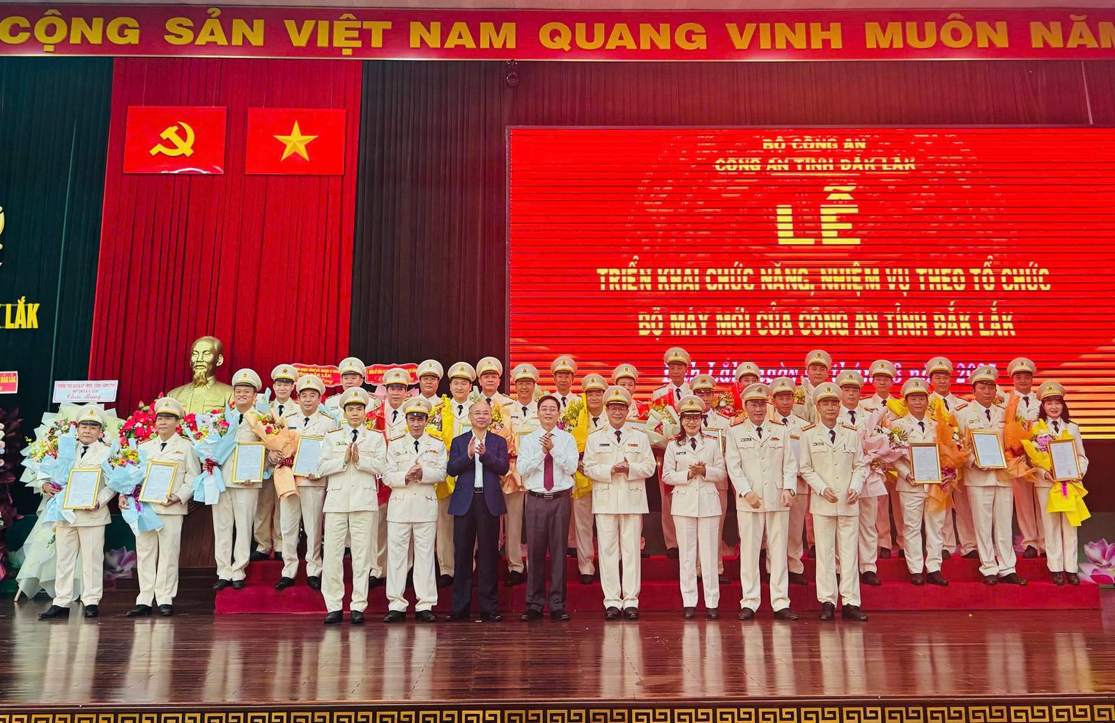 Lãnh đạo Tỉnh uỷ, UBND tỉnh Đắk Lắk chúc mừng 27 thủ trưởng các đơn vị chức năng thuộc Công an tỉnh sau khi sắp xếp. Ảnh: NG