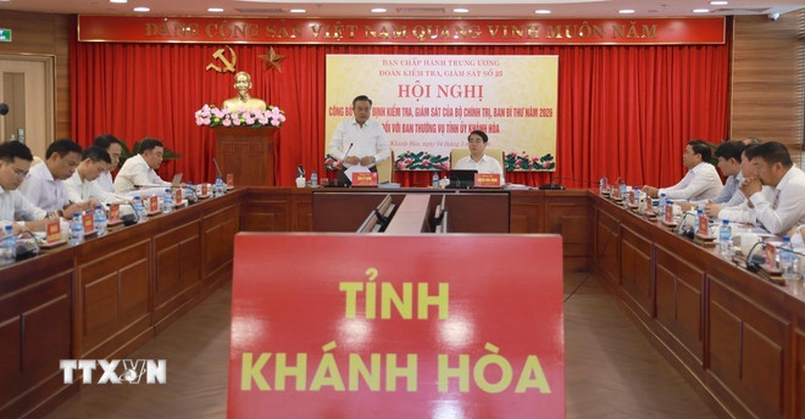 Ngày 4/3/2026, Đoàn Kiểm tra, giám sát số 25 của Bộ Chính trị, Ban Bí thư do đồng chí Trần Sỹ Thanh, Ủy viên Bộ Chính trị, Chủ nhiệm Ủy ban Kiểm tra Trung ương làm Trưởng đoàn, công bố Quyết định số 25-QĐNS/TW, ngày 23/02/2026 của Bộ Chính trị về thành lập Đoàn Kiểm tra, giám sát của Bộ Chính trị, Ban Bí thư năm 2026 tại tỉnh Khánh Hòa. Ảnh: Xuân Triệu/TTXVN