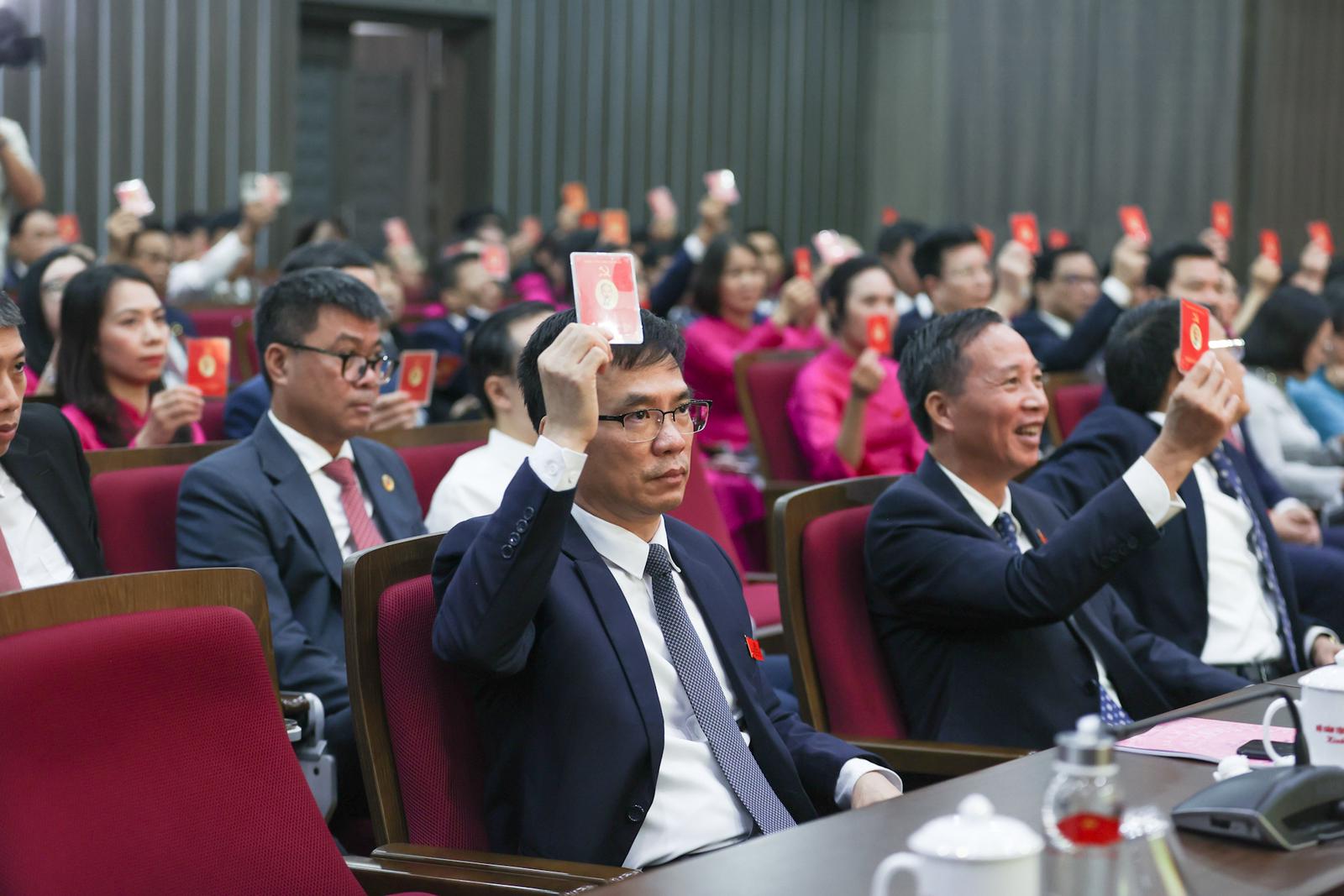 Các đảng viên giơ thẻ biểu quyết các nội dung tại Đại hội. Ảnh: BDT