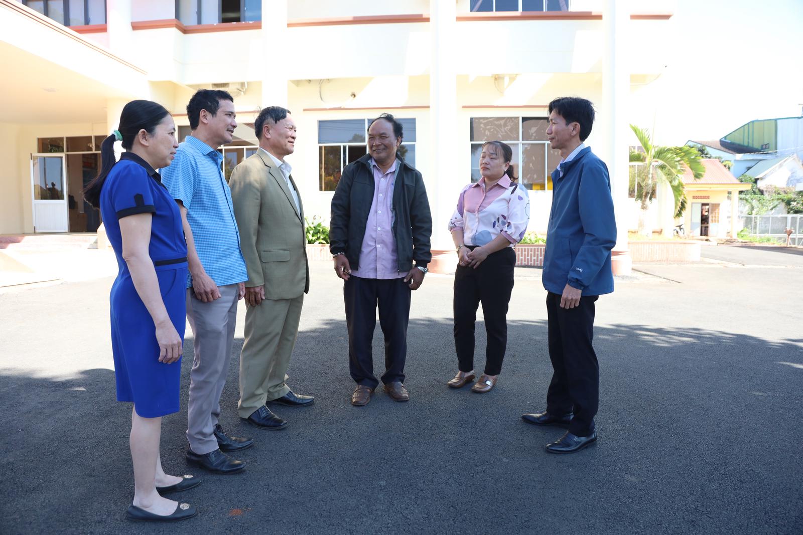 Trưởng Ban Tổ chức Huyện ủy Ea H'leo Nguyễn Hữu Trường (bìa phải) trao đổi với cán bộ huyện về công tác sắp xếp bộ máy hệ thống chính trị tinh gọn. Ảnh: LT