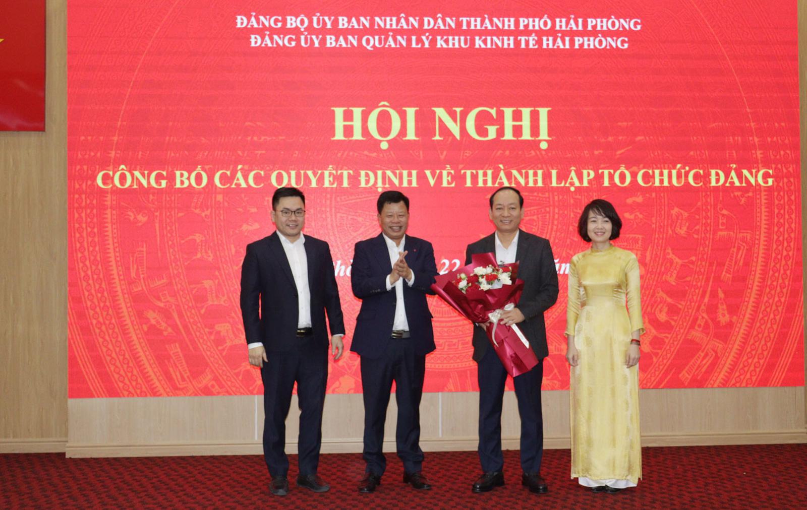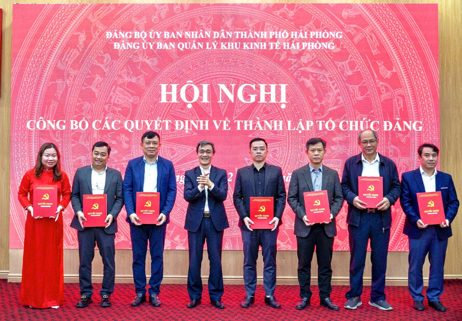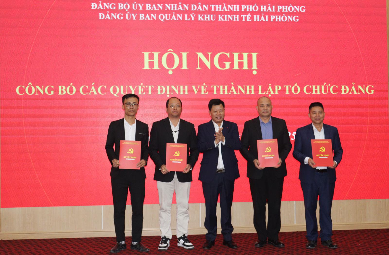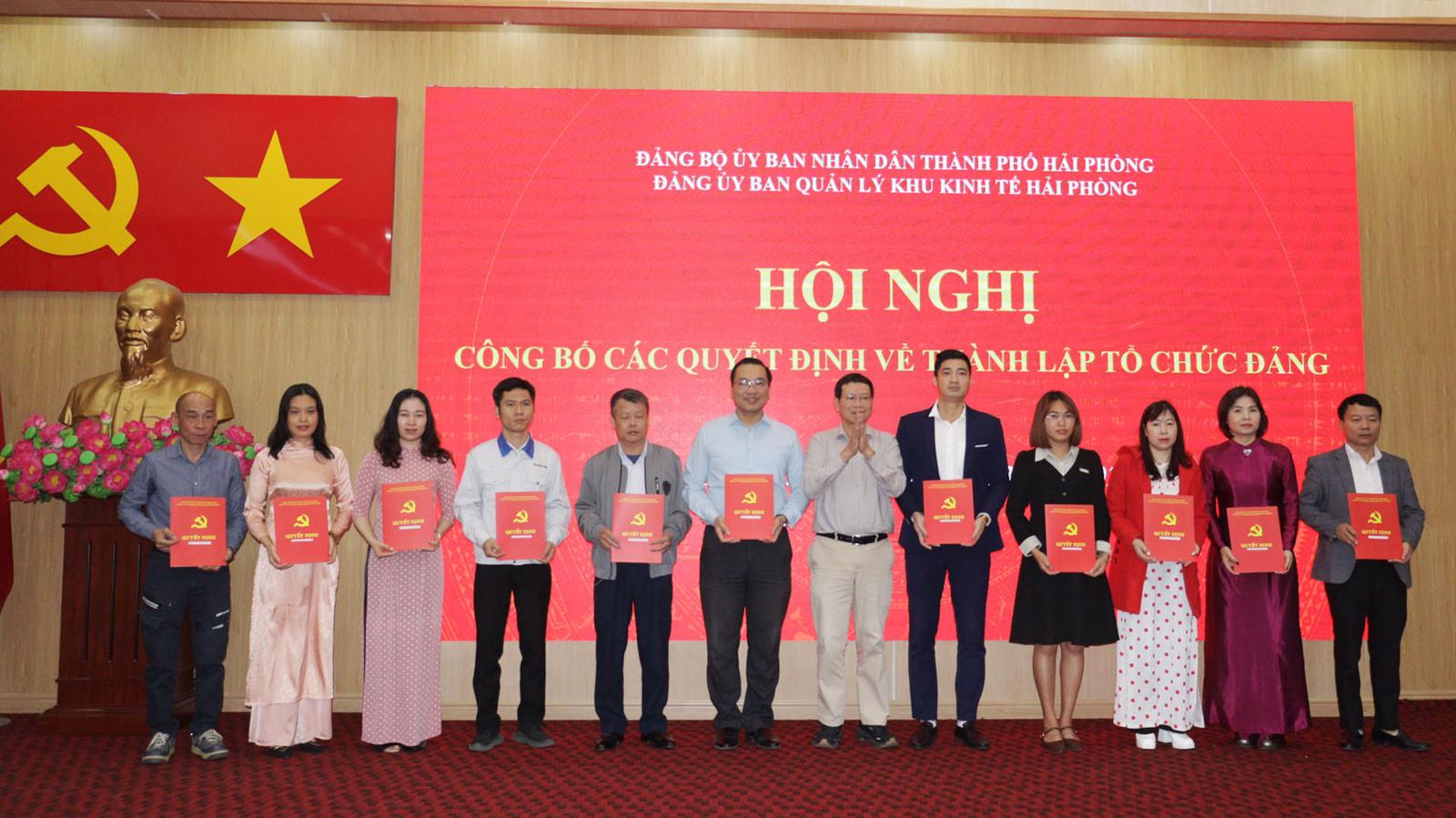 Hội nghị cũng công bố quyết định và trao các quyết định của Đảng ủy Ban Quản lý Khu kinh tế Hải Phòng về thành lập các tổ chức Đảng. Theo đó, thành lập Đảng bộ Bộ phận Khu công nghiệp Nhật Bản - Hải Phòng gồm có 365 đảng viên và 26 chi bộ trực thuộc; thành lập Đảng bộ Bộ phận Khu công nghiệp Nam Cầu Kiền gồm có 43 đảng viên và 4 chi bộ trực thuộc; thành lập Đảng bộ Bộ phận Công ty Cổ phần Khu công nghiệp Sài Gòn - Hải Phòng gồm có 35 đảng viên và 2 chi bộ trực thuộc; thành lập Đảng bộ Bộ phận Công ty TNHH Regina Miracle International Việt Nam gồm có 132 đảng viên và 5 chi bộ trực thuộc; thành lập Đảng bộ Bộ phận Công ty TNHH LG Display Việt Nam Hải Phòng gồm có 48 đảng viên và 4 chi bộ trực thuộc. Đảng ủy Ban Quản lý Khu kinh tế Hải Phòng cũng công bố các quyết định về thành lập các chi bộ trực thuộc.