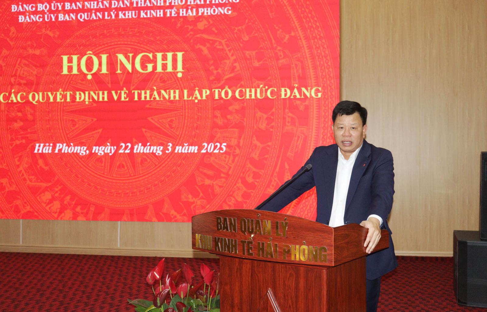Tại hội nghị, Phó Bí thư Đảng ủy UBND thành phố Phạm Quang Sáng đã công bố Quyết định của Đảng ủy UBND thành phố về việc thành lập Đảng bộ Ban Quản lý Khu kinh tế Hải Phòng trực thuộc Đảng ủy UBND thành phố trên cơ sở tiếp nhận từ Đảng bộ Khu kinh tế Hải Phòng, gồm 5 đảng bộ, 88 chi bộ với 1.185 đảng viên.