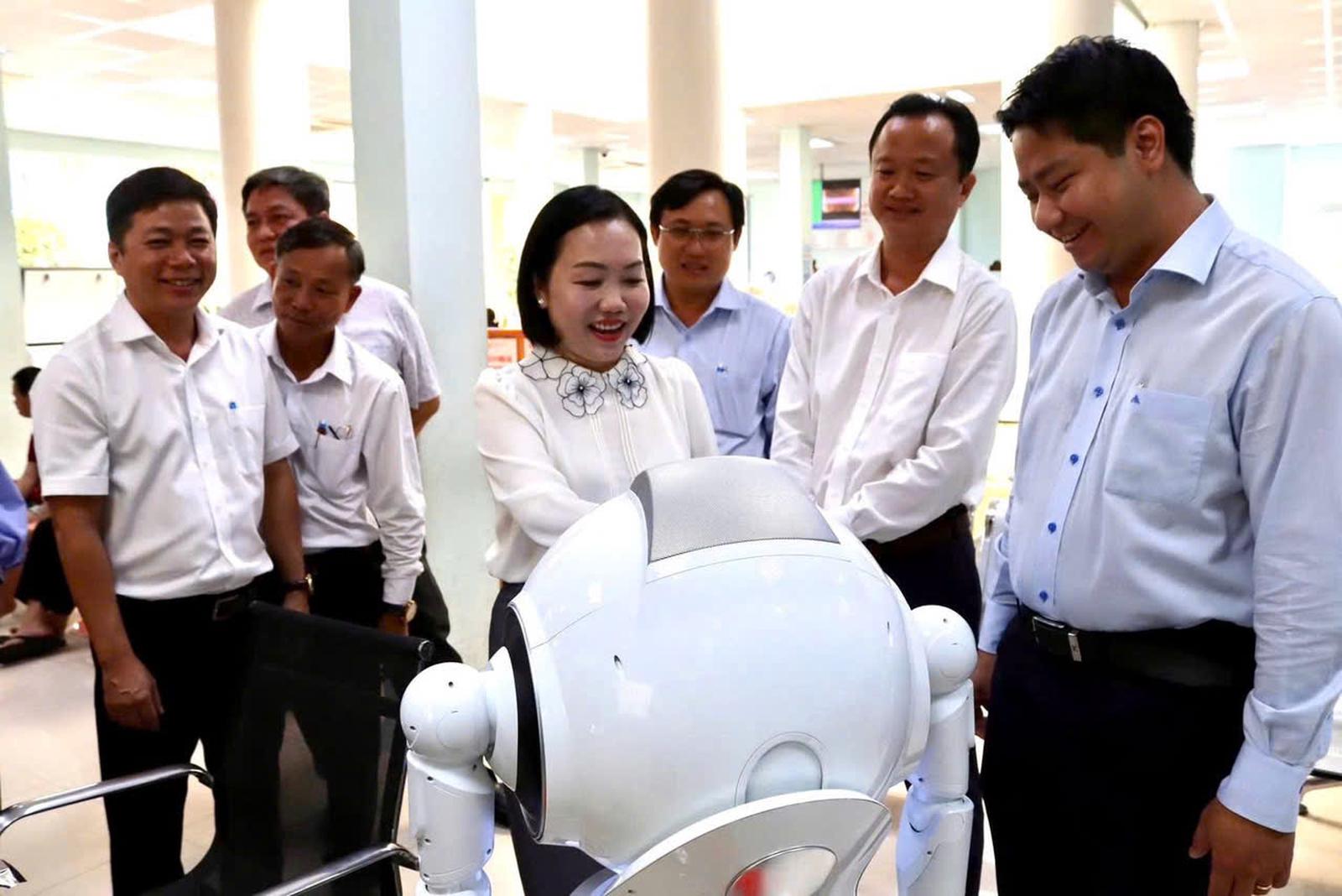 Ông Trần Phong Lưu, Chủ tịch UBND (ngoài cùng bên phải ảnh) cùng lãnh đạo UBND phường Thủ Dầu Một "tương tác" cùng robot tại TTPVHCC. Ảnh: An Toàn