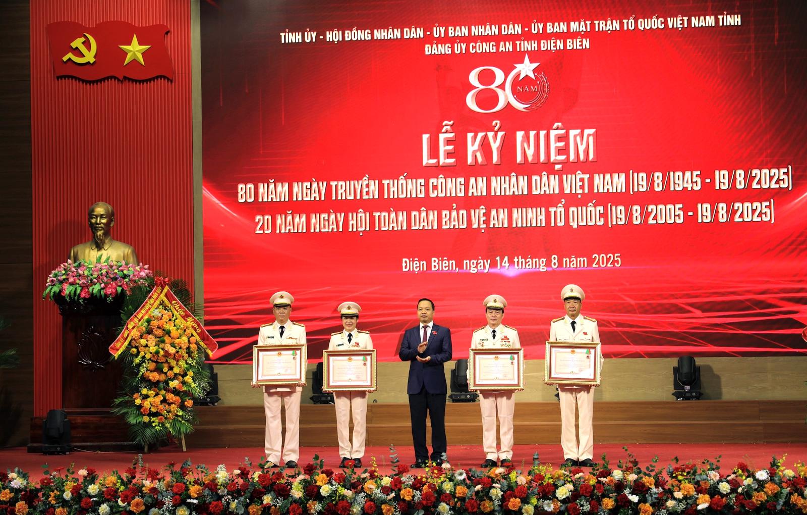 Lãnh đạo tỉnh Điện Biên tặng hoa chúc mừng Công an tỉnh. Ảnh: Ngọc Thuỷ