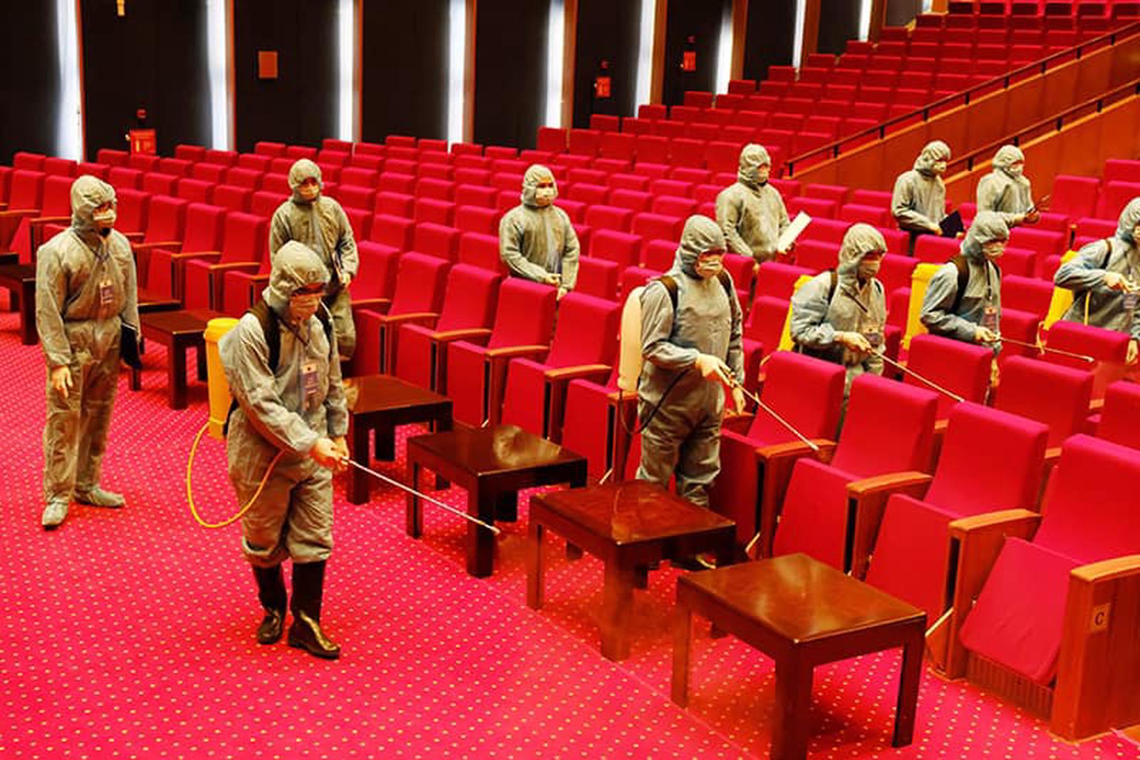 Diễn tập phun khử khuẩn bên trong hội trường phục vụ Đại hội. Ảnh: TM