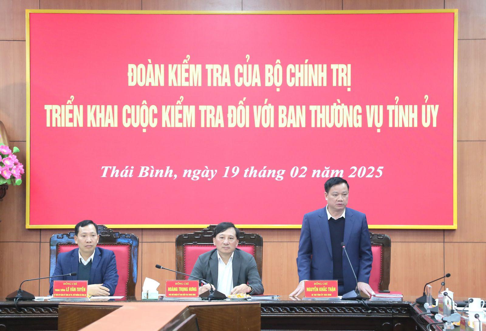 “Ban Thường vụ Tỉnh ủy Thái Bình sẽ chấp hành nghiêm túc, đầy đủ các yêu cầu của Đoàn kiểm tra; trước mắt sẽ khẩn trương chuẩn bị và hoàn thành báo cáo để gửi về Đoàn kiểm tra bảo đảm tiến độ, đúng, đủ nội dung, số liệu theo đề cương gợi ý của Đoàn kiểm tra”, Bí thư Tỉnh ủy Thái Bình khẳng định.