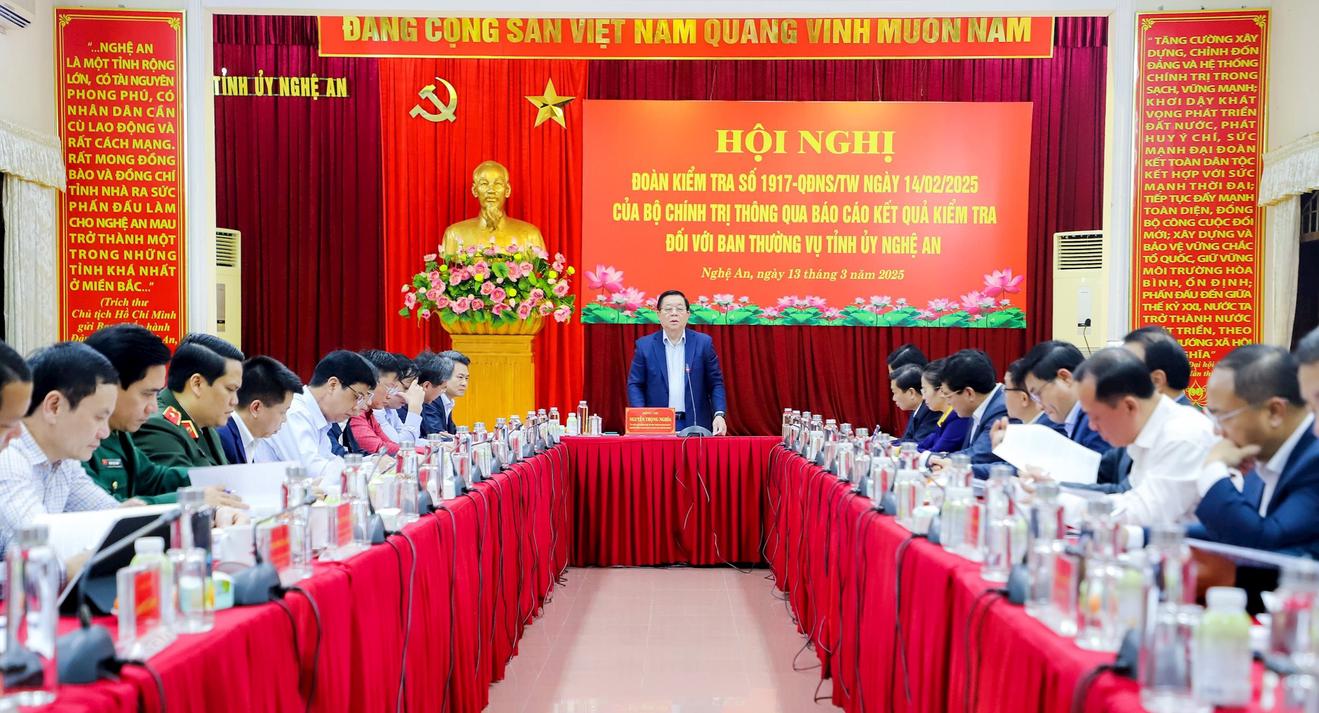 Ban Thường vụ Tỉnh ủy Nghệ An đã tiếp thu đã tiếp thu kết quả kiểm tra việc lãnh đạo, chỉ đạo và tổ chức thực hiện một số chuyên đề công tác năm 2025 của Đoàn Kiểm tra số 1917 của Bộ Chính trị để khắc phục trong thời gian tới.