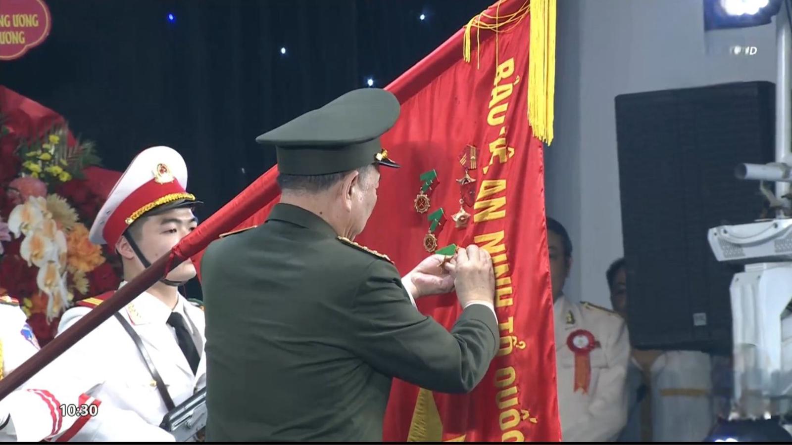 Bộ trưởng Bộ Công an Tô Lâm gắn danh hiệu lên lá cờ truyền thống. Ảnh: Xuân Thống