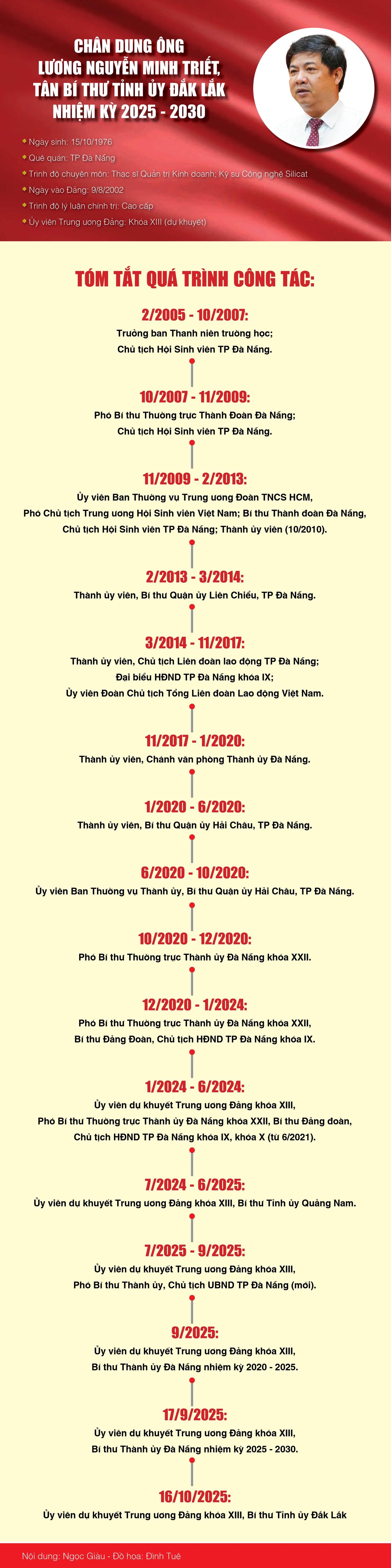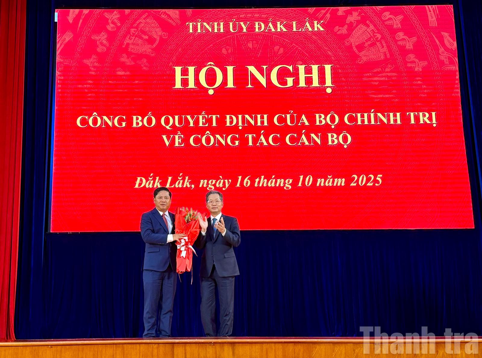 Chiều 16/10, Tỉnh uỷ Đắk Lắk tổ chức Hội nghị công bố quyết định của Bộ Chính trị về việc điều động, chỉ định đồng chí Lương Nguyễn Minh Triết - Ủy viên dự khuyết Trung ương Đảng, Bí thư Thành ủy Đà Nẵng tham gia Ban Chấp hành, Ban Thường vụ và giữ chức Bí thư Tỉnh ủy Đắk Lắk, nhiệm kỳ 2025-2030 từ ngày 16/10/2025, thay cho đồng chí Nguyễn Đình Trung vừa được Bộ Chính trị điều động, chỉ định làm Bí thư Thành ủy TP – Huế.