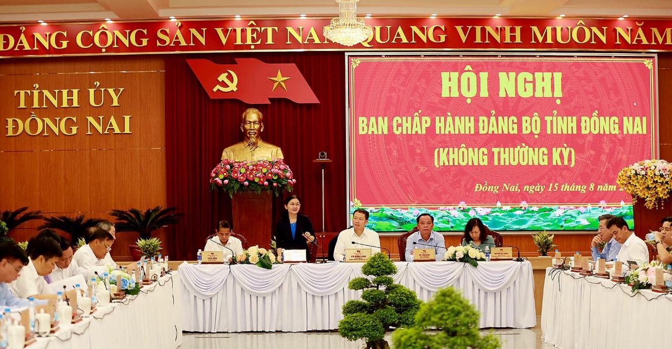 Bí thư Tỉnh uỷ Vũ Hồng Văn cùng các đồng chí Thường trực Tỉnh uỷ tại Hội nghị BCH Đảng bộ tỉnh Đồng Nai không thường kỳ ngày 15/8. Ảnh: Huy Anh