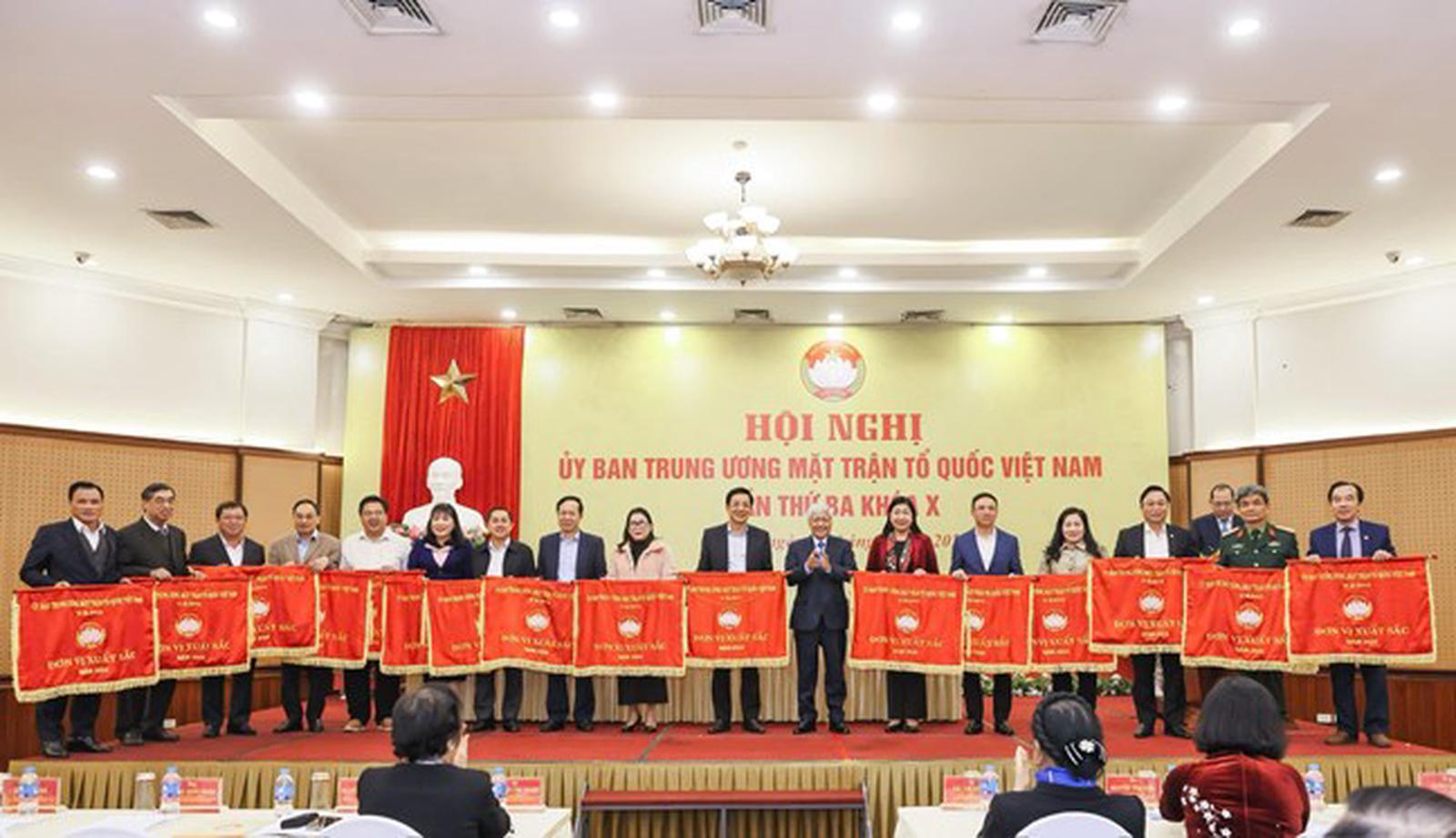 Chủ tịch MTTQ Việt Nam Đỗ Văn Chiến trao cờ thi đua của UBTƯ MTTQ Việt Nam cho các các đơn vị có thành tích xuất sắc trong công tác Mặt trận năm 2024. Ảnh: Q.Vinh