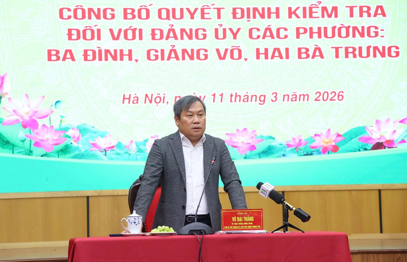 (Thanh tra) - Sáng 11/3, Chủ tịch UBND thành phố Hà Nội Vũ Đại Thắng, Trưởng đoàn kiểm tra số 3 của Ban Thường vụ Thành ủy chủ trì hội nghị công bố quyết định kiểm tra đối với Đảng ủy 3 phường: Ba Đình, Giảng Võ, Hai Bà Trưng.