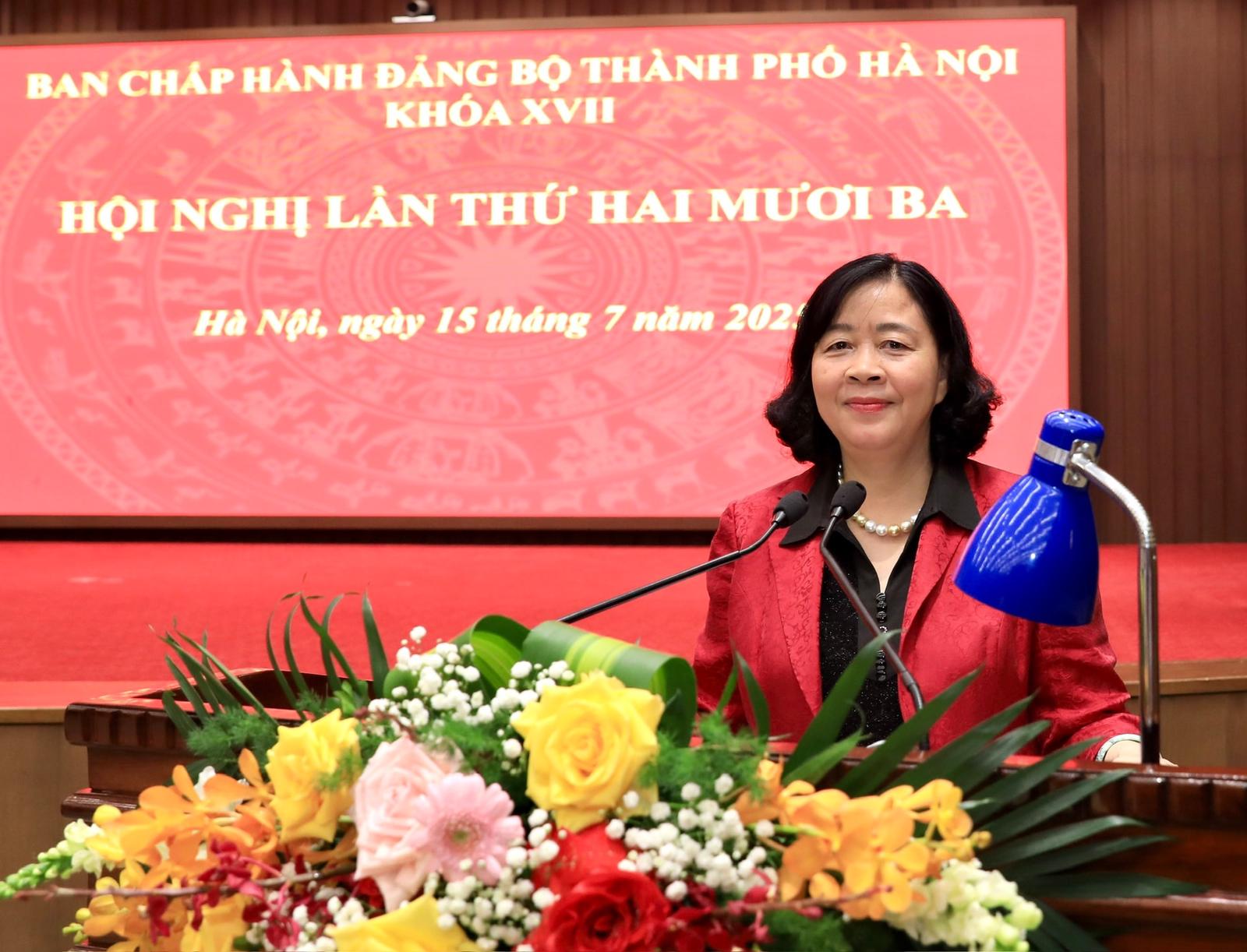Bí thư Thành ủy Hà Nội Bùi Thị Minh Hoài phát biểu chỉ đạo hội nghị. Ảnh: Viết Thành