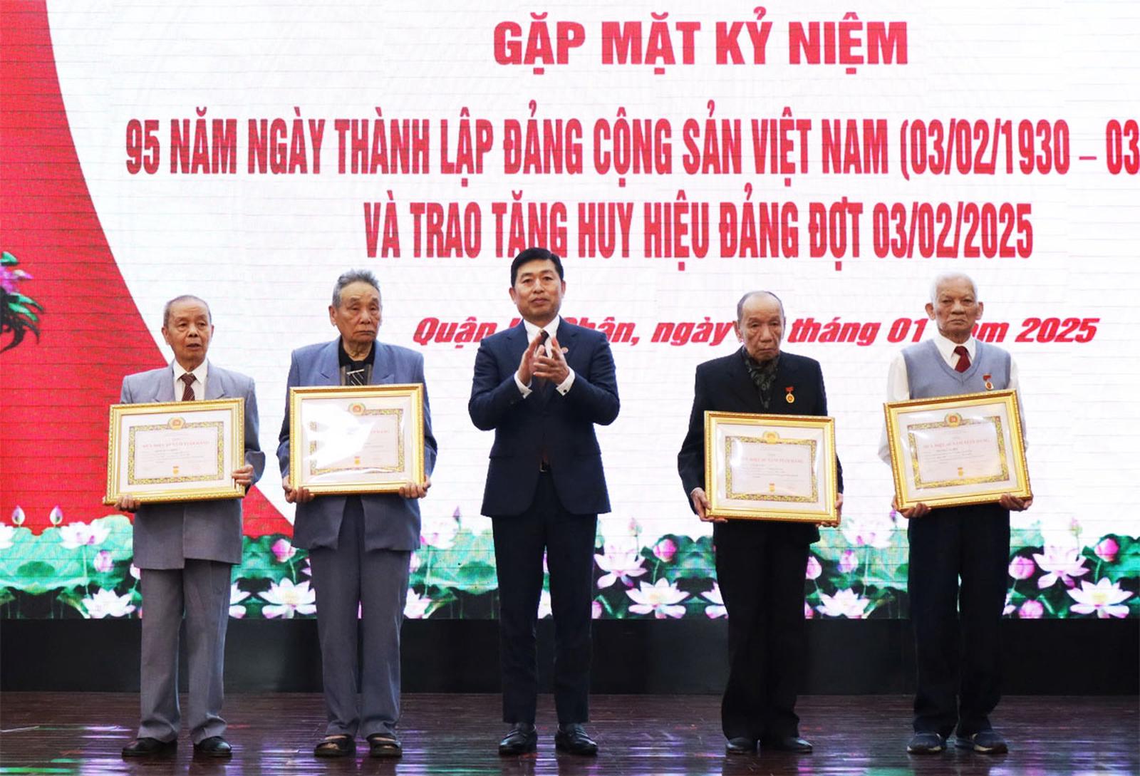 Các đồng chí lãnh đạo thành phố, quận trân trọng trao, chúc mừng các đồng chí được nhận Huy hiệu Đảng và nhấn mạnh, các đồng chí được đón nhận Huy hiệu Đảng, đây chính là phần thưởng cao quý, là sự ghi nhận, tôn vinh của Đảng, Nhà nước và Nhân dân đối với những cống hiến, những công lao mà các đồng chí đã đóng góp vào sự nghiệp đấu tranh cách mạng giành độc lập dân tộc và xây dựng, bảo vệ Tổ quốc; đây là niềm vinh dự, tự hào không chỉ của cá nhân mỗi đồng chí mà còn là niềm vui chung, niềm tự hào chung của gia đình, chi bộ, toàn Đảng bộ quận và Đảng bộ thành phố Hải Phòng.